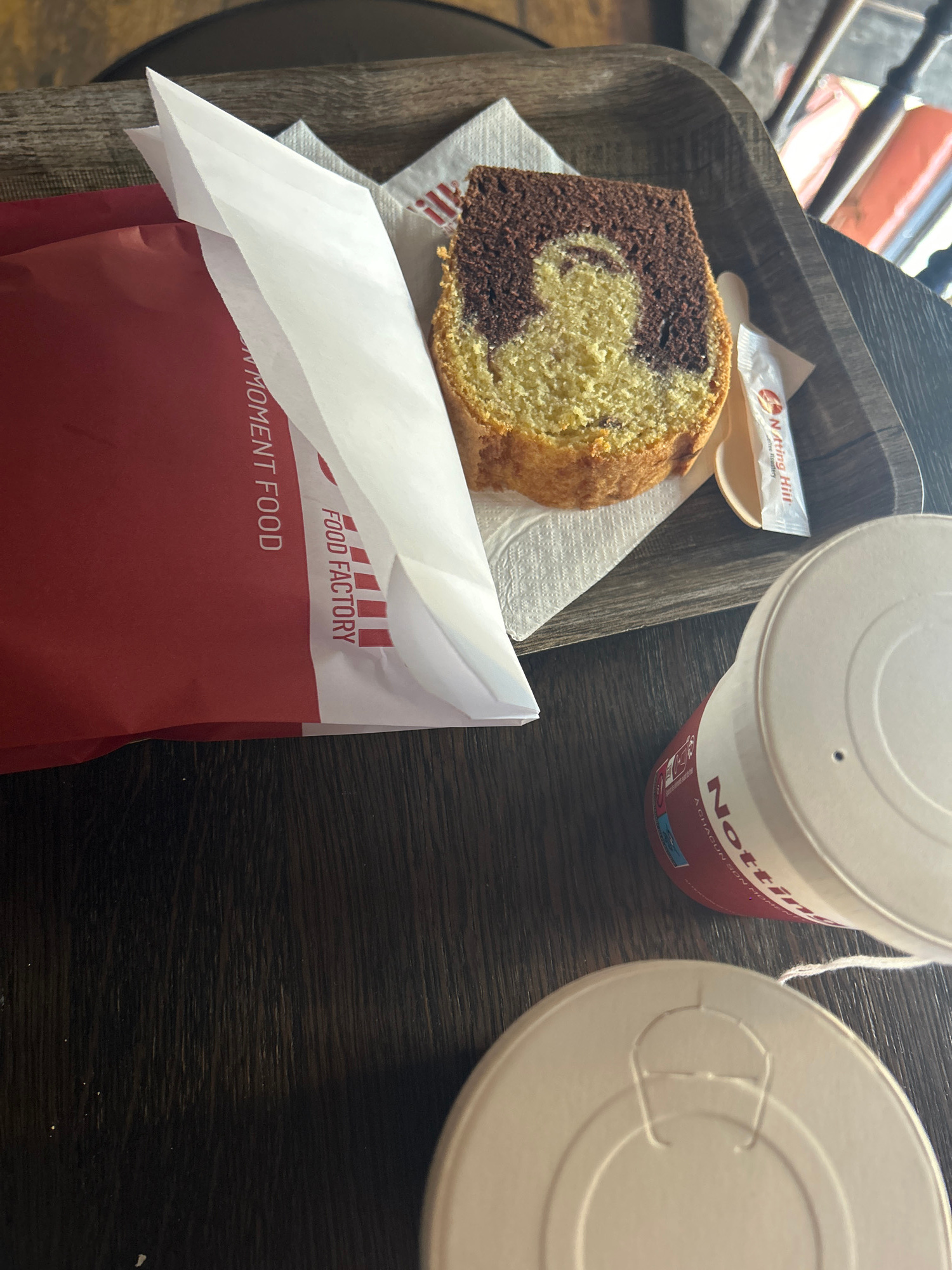 A high-angle shot presents a food and beverage arrangement on a dark, wood-grained table. The items are contained on a dark wooden tray. On the left of the tray is a slice of marble pound cake, presenβ¦read more