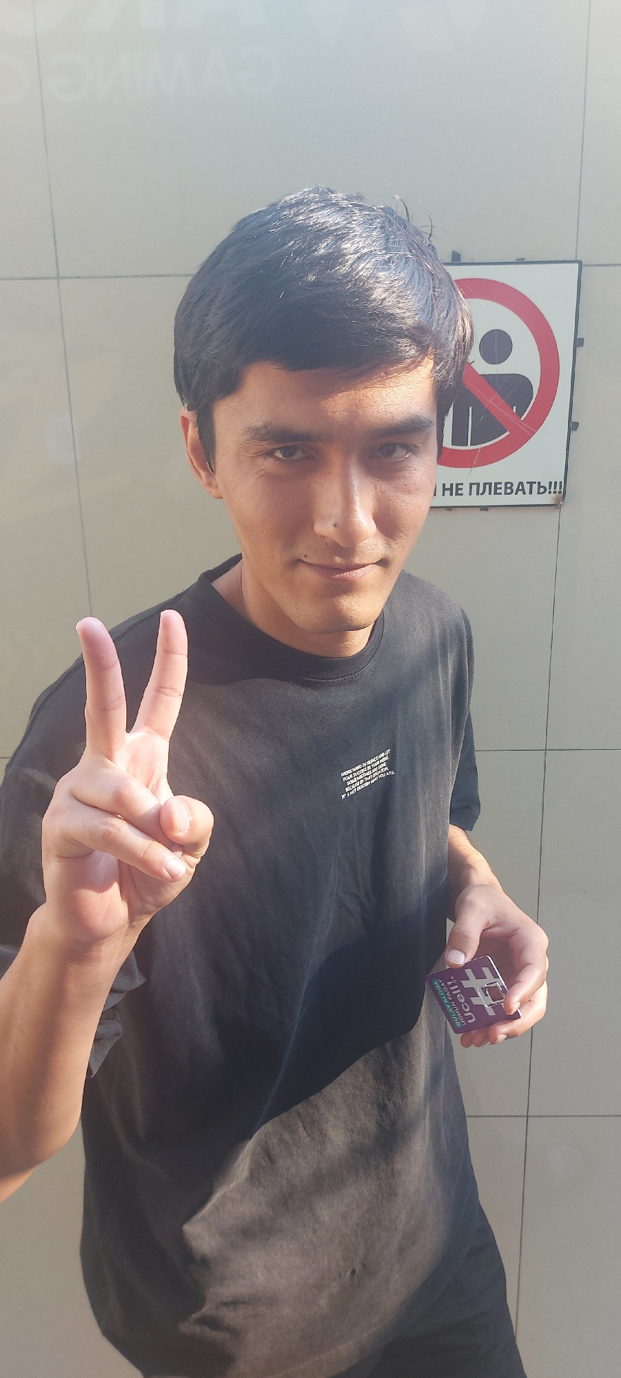 A person is posing outdoors in front of a light-colored wall, likely in Tashkent, Uzbekistan. The person is wearing a dark t-shirt and holding a small, purple and white card with Cyrillic text in thei…read more