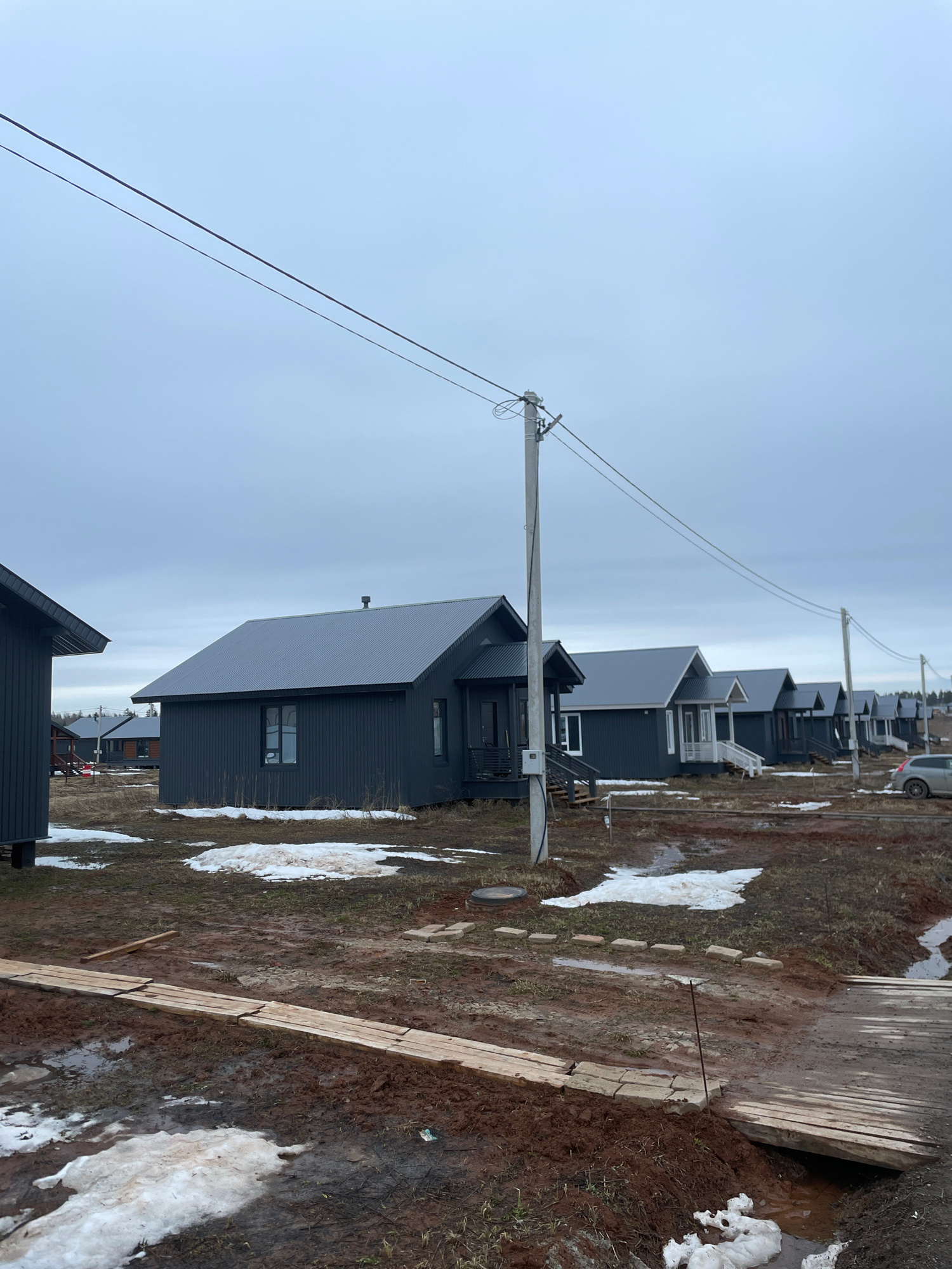 The image depicts a row of dark-colored houses, possibly newly constructed, in Подшивалово, Russia. The sky is overcast. In the foreground, the ground is muddy with patches of melting snow. Planks of…read more