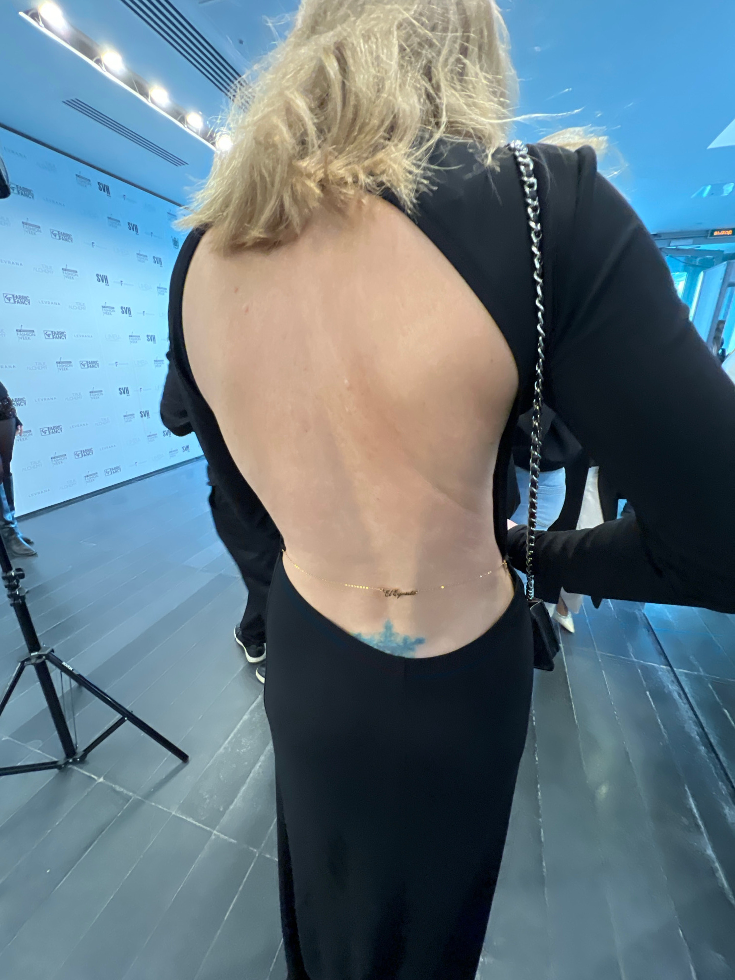 Here is a description of the image: A woman with blond hair and wearing a black dress is seen from behind. The dress has a large cutout in the back, revealing most of her back. A thin gold chain drap…read more