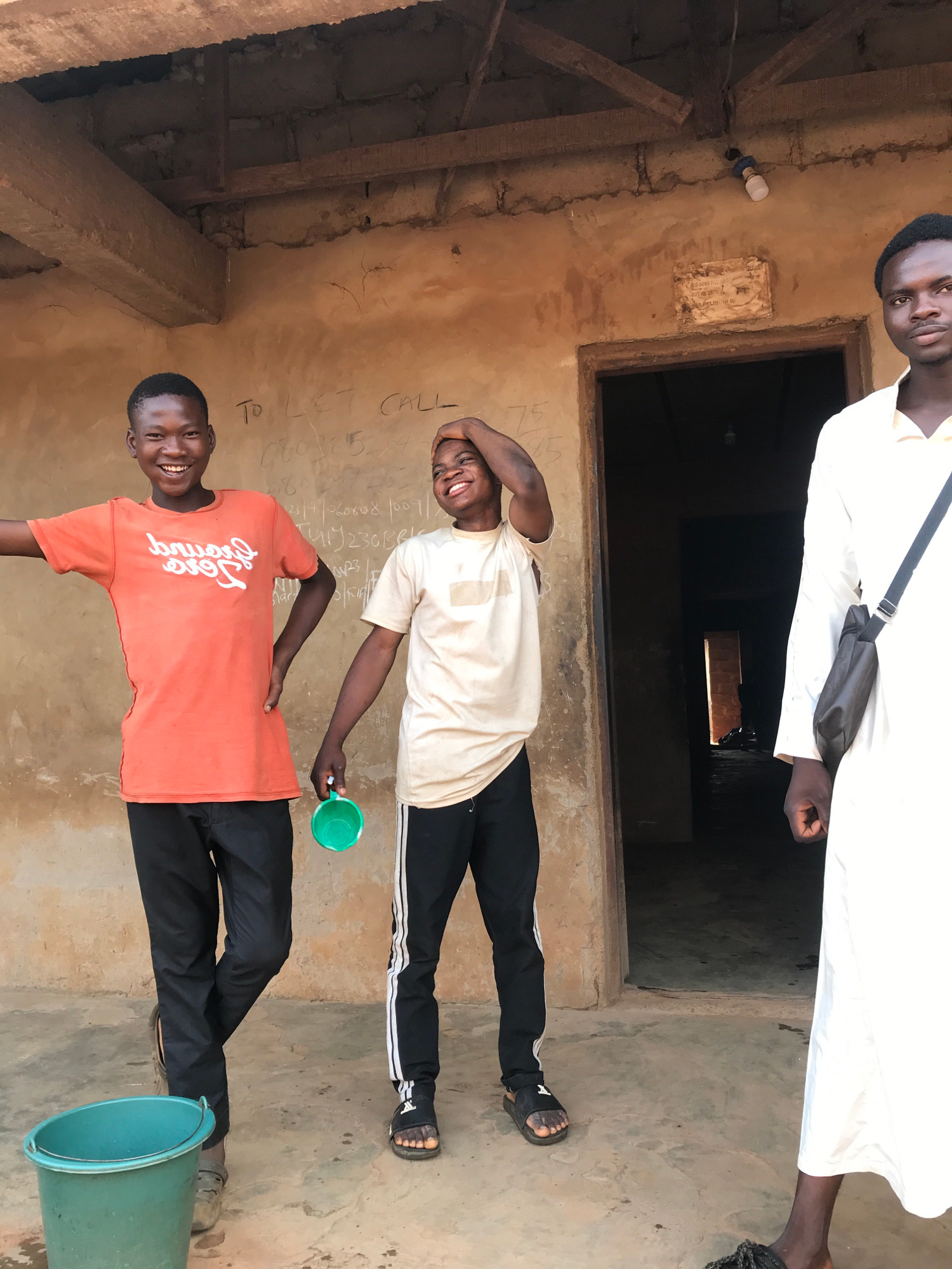 Three men are standing outdoors or in a semi-sheltered area against an earthen-colored, unplastered wall with a concrete ground, likely in Ilorin, Nigeria, given the context. The image is taken during…read more