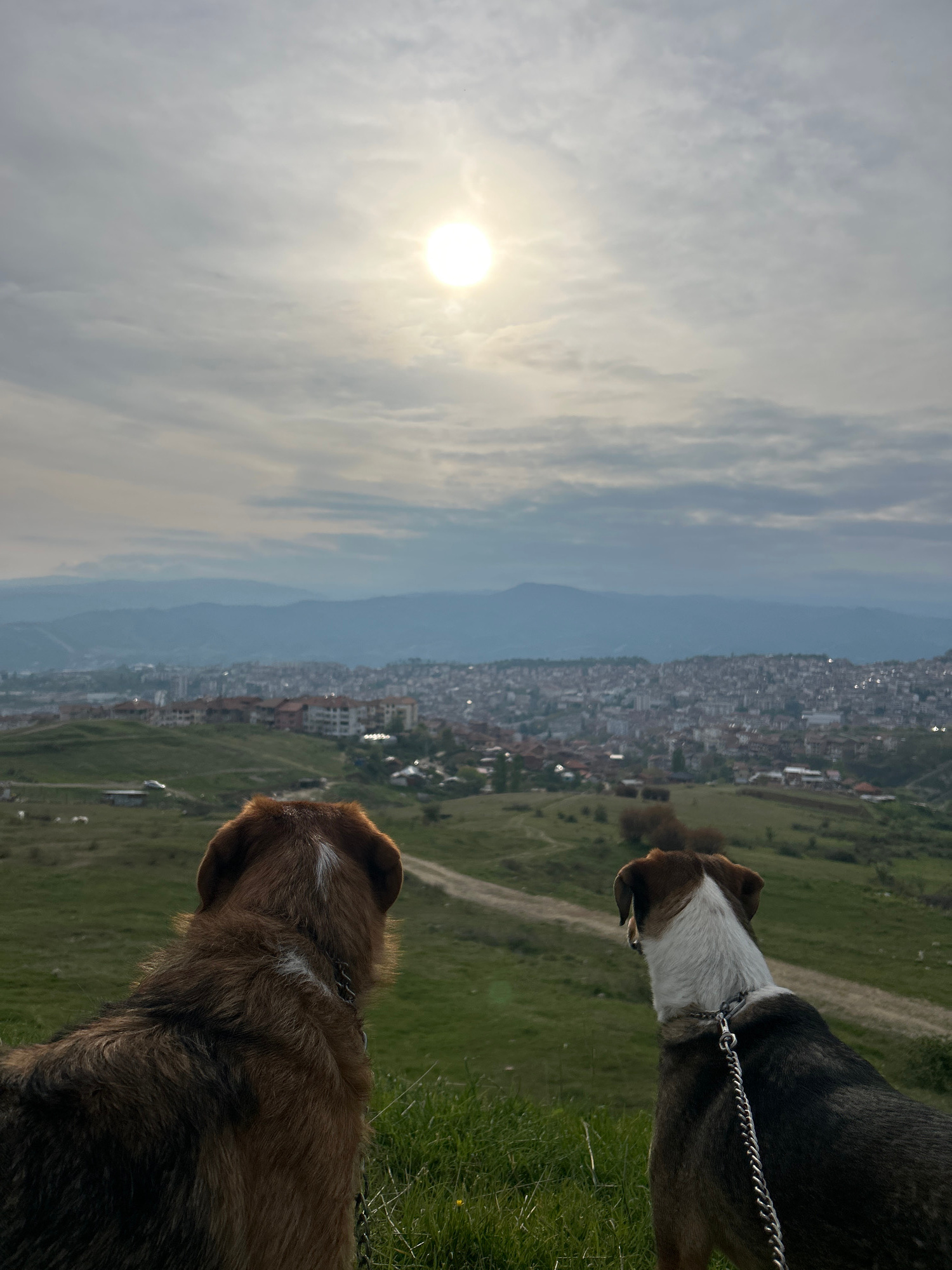 The image shows two dogs from the back, standing on a grassy hill overlooking Sandanski, Bulgaria. The skyline of Sandanski is visible in the background, situated between the hill and distant mountain…read more