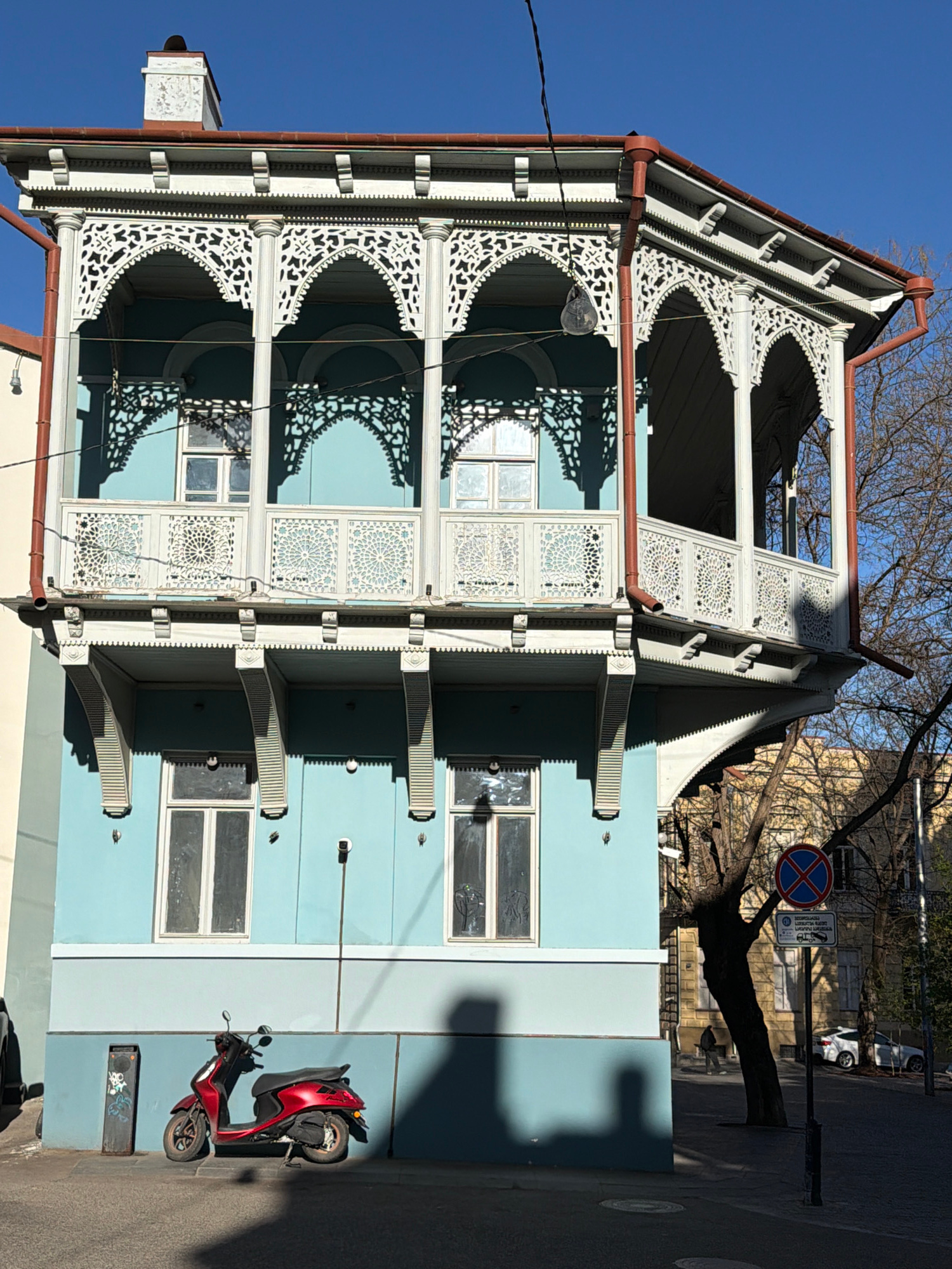 The image shows a three-story building in Tbilisi, Georgia. The building has a light blue exterior with decorative white wooden balconies on each floor. The balconies feature intricate latticework andβ¦read more