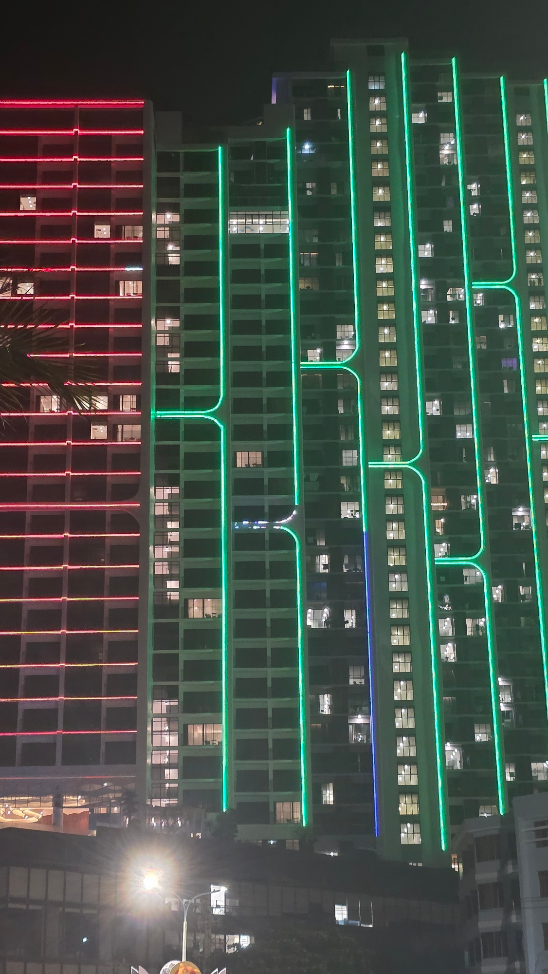 At night, a tall building in Bắc Nha Trang, Vietnam is illuminated with green and red neon lights along its exterior. The building has multiple stories, with the lower levels featuring vertical red li…read more