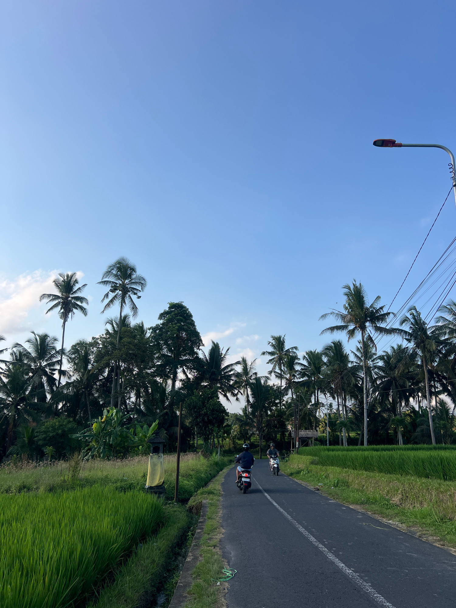 The image captures a serene, tropical rural landscape, likely in Tampaksiring, Indonesia, featuring a narrow paved road flanked by lush rice paddies and abundant palm trees under a clear blue sky. In…read more