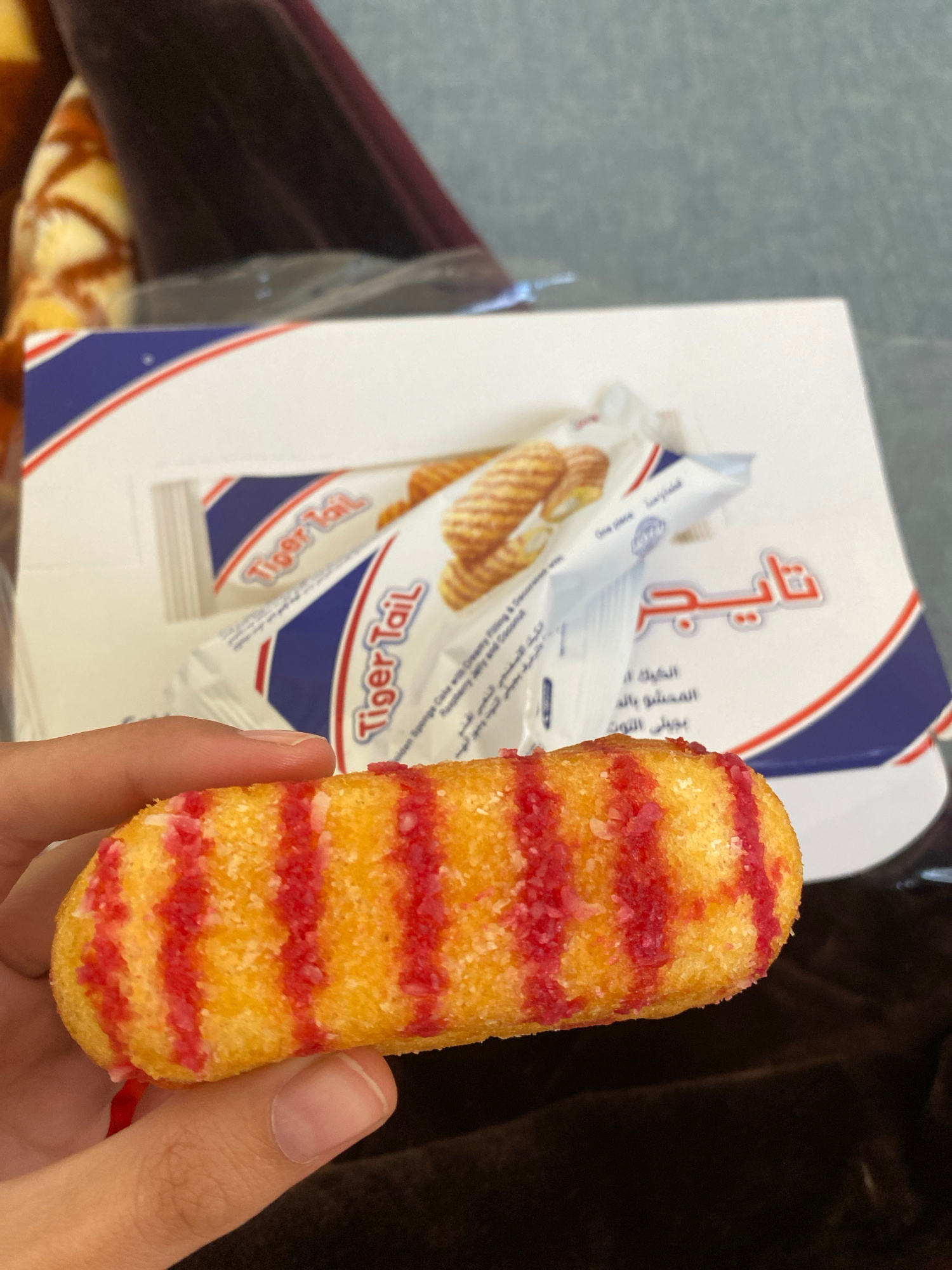 A hand holds a cylindrical sponge cake, horizontally striped with red sugar crystals, in front of a partially visible box and wrapped individual cakes labeled "Tiger Tail." The box is white with blue…read more