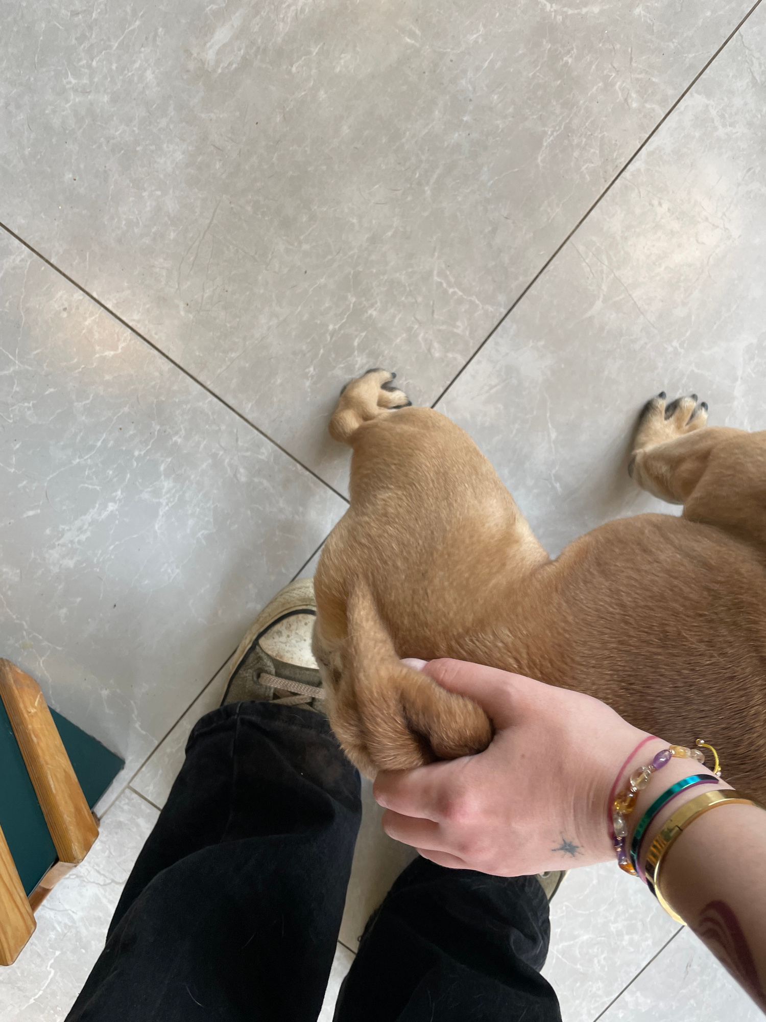 A close-up shot shows a person in black jeans and worn sneakers holding the paw of a fawn-colored dog on a light gray tile floor. The person wears multiple bracelets on their left wrist and has a smalβ¦read more