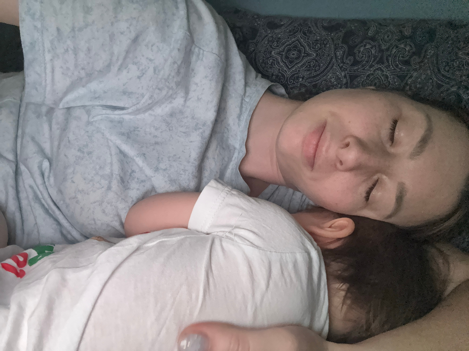 A woman is lying down with her eyes closed, and a baby is lying on top of her. The woman is wearing a light blue shirt, and the baby is wearing a white shirt. The woman is lying on a patterned pillow.…read more
