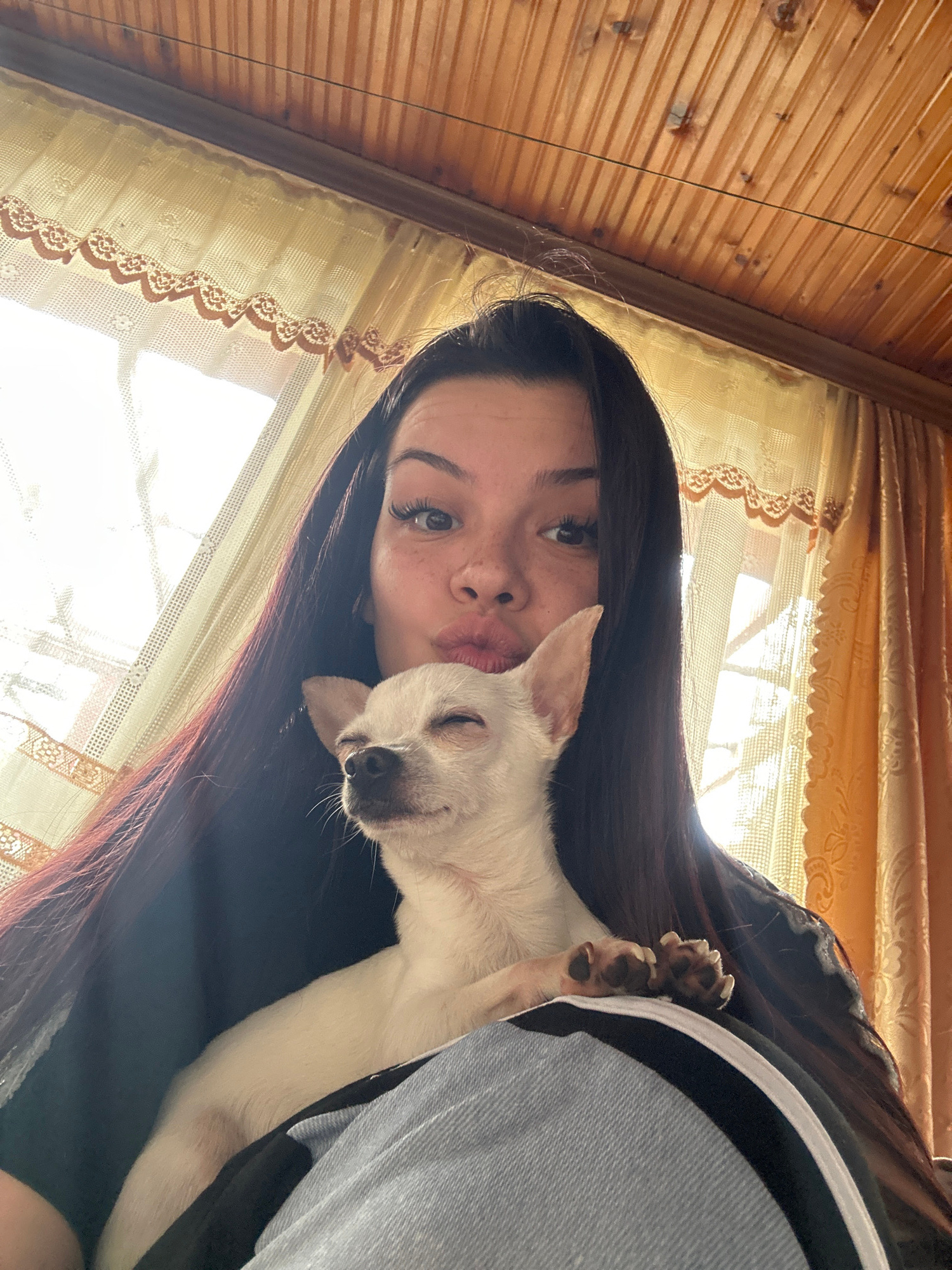 A rotated, close-up selfie shows a young woman with long, dark hair and a small, white dog. The woman is pouting her lips towards the camera, while the dog is nestled close to her face, its eyes parti…read more