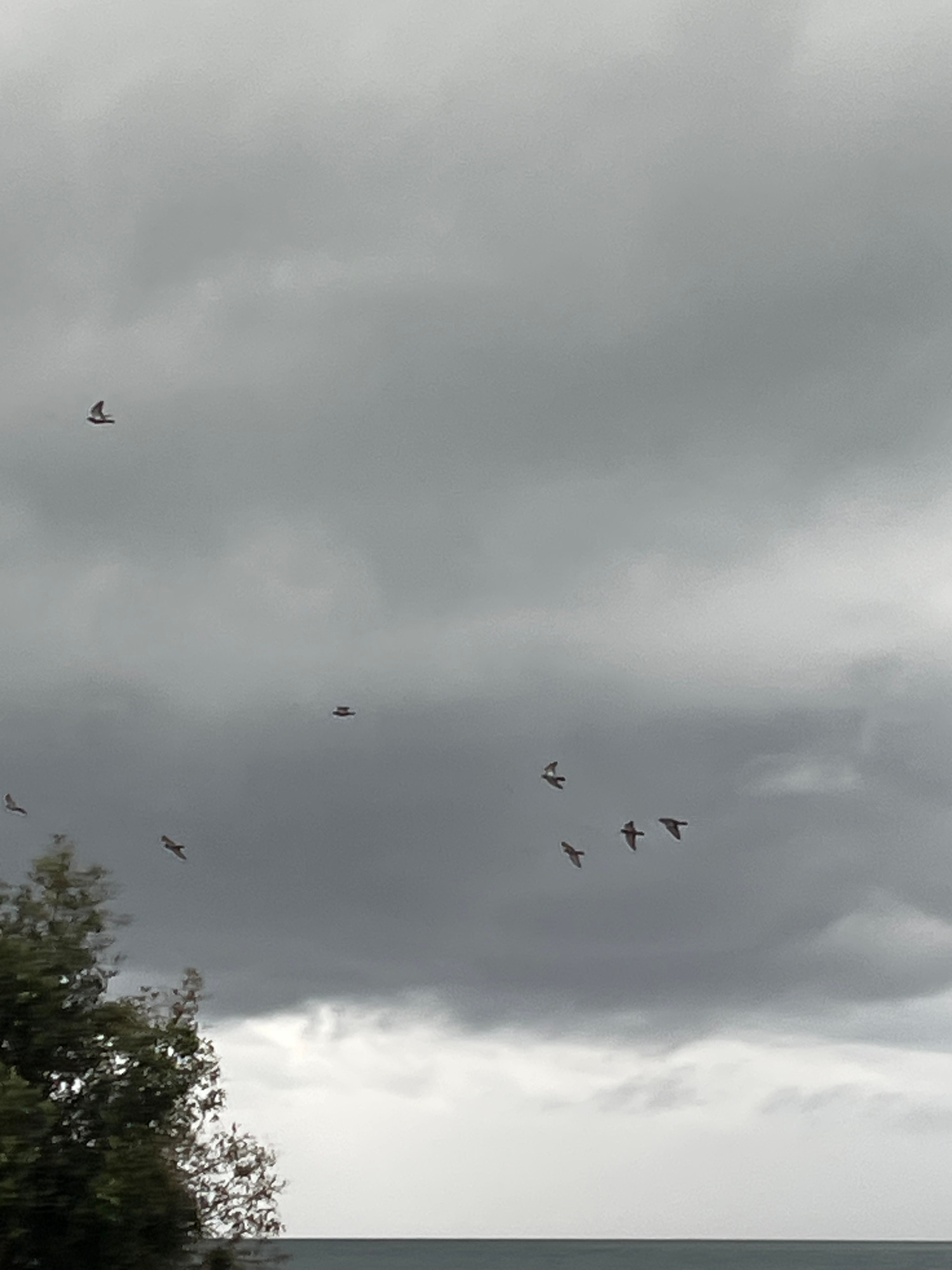 The image shows a flock of birds flying against a cloudy, overcast sky. Below the birds, a tree with foliage is visible. The location is not explicitly stated or discernible from the image's visual co…read more