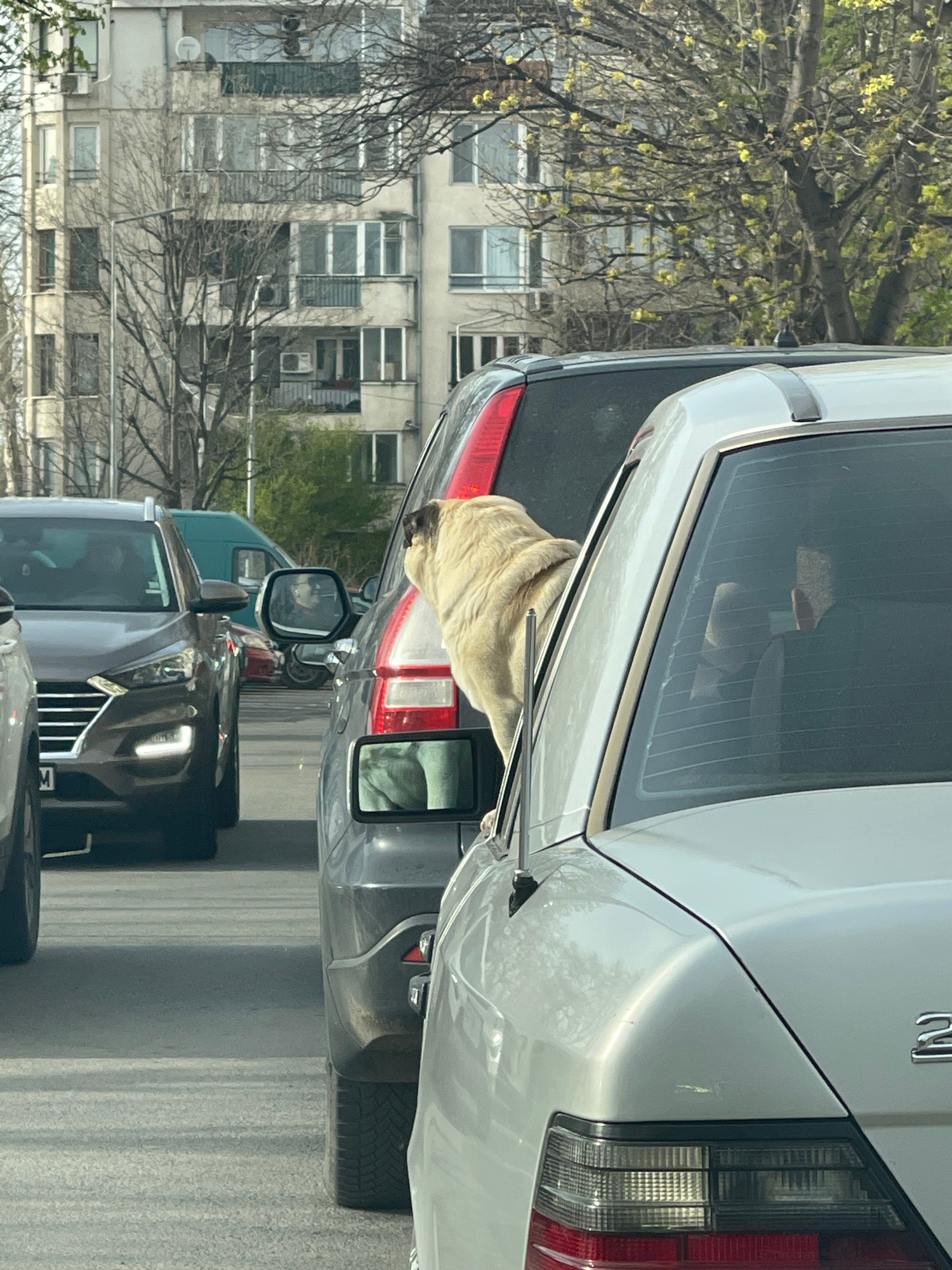 A photograph shows a street in what appears to be the city of Burgas, Bulgaria. The image is taken from a position within traffic, with a close focus on several vehicles. A silver-colored car is posit…read more