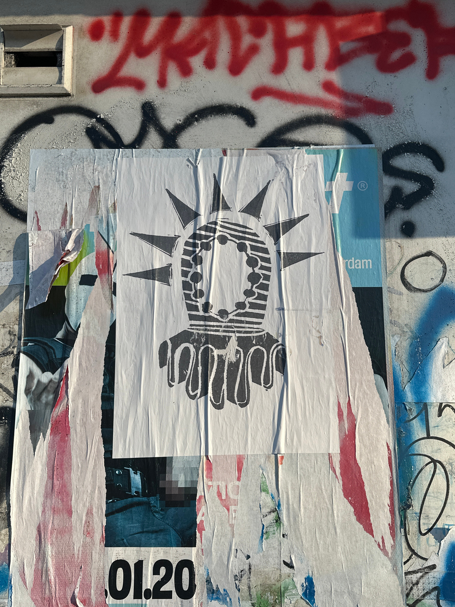 A street scene in Amsterdam, Netherlands, depicts a section of a concrete wall adorned with layered posters and graffiti. The wall itself is gray and shows signs of weathering and wear, evidenced by p…read more