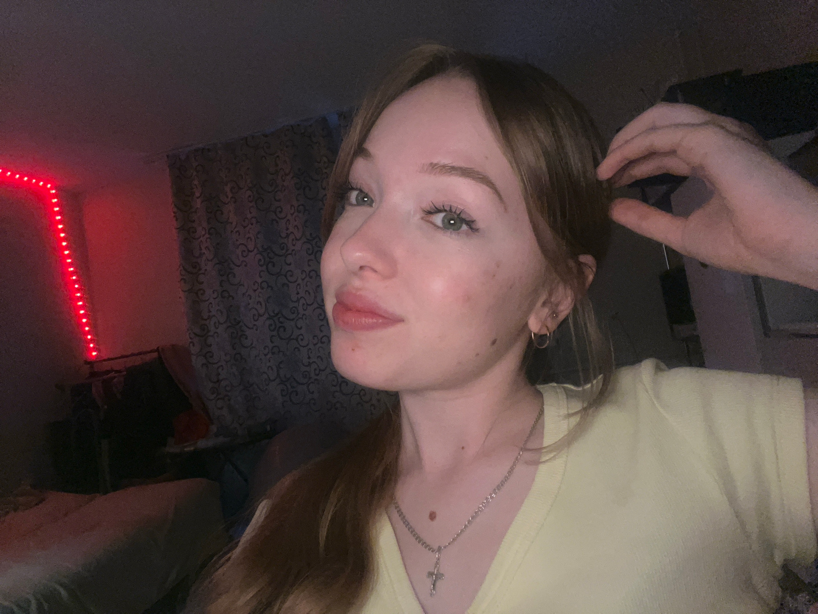 A photograph of a light-skinned female wearing a yellow V-neck shirt and a silver chain with a cross charm, situated indoors. Her face is turned towards the camera; her hair is partially obscuring her…read more