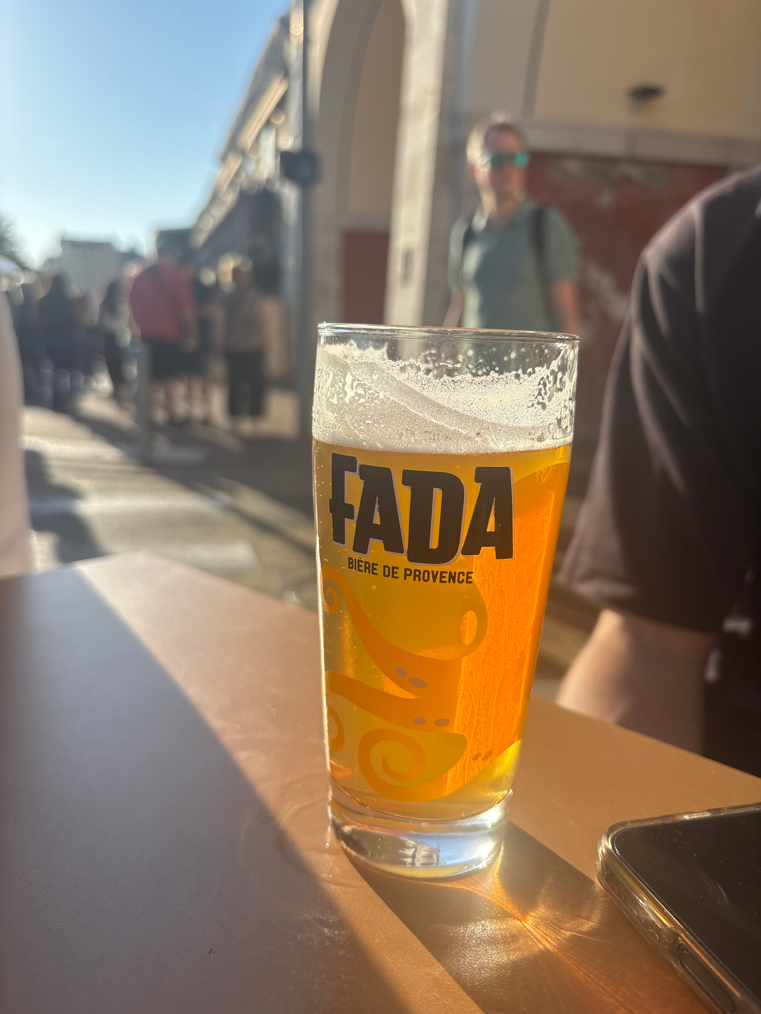 The image shows a glass of Fada Bière de Provence on a table in an outdoor setting, likely a café or restaurant. The glass is partially filled with beer and has a foamy head. The Fada logo is prominen…read more