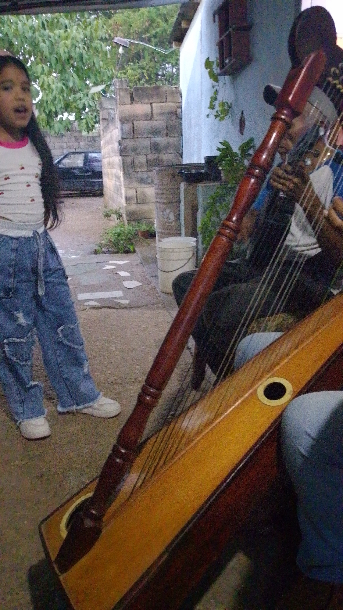 The image shows a young girl standing to the left of a Paraguayan harp played by a man, likely in the city of Tinaquillo, Venezuela. **People:** A young girl with long dark hair is standing to the leβ¦read more