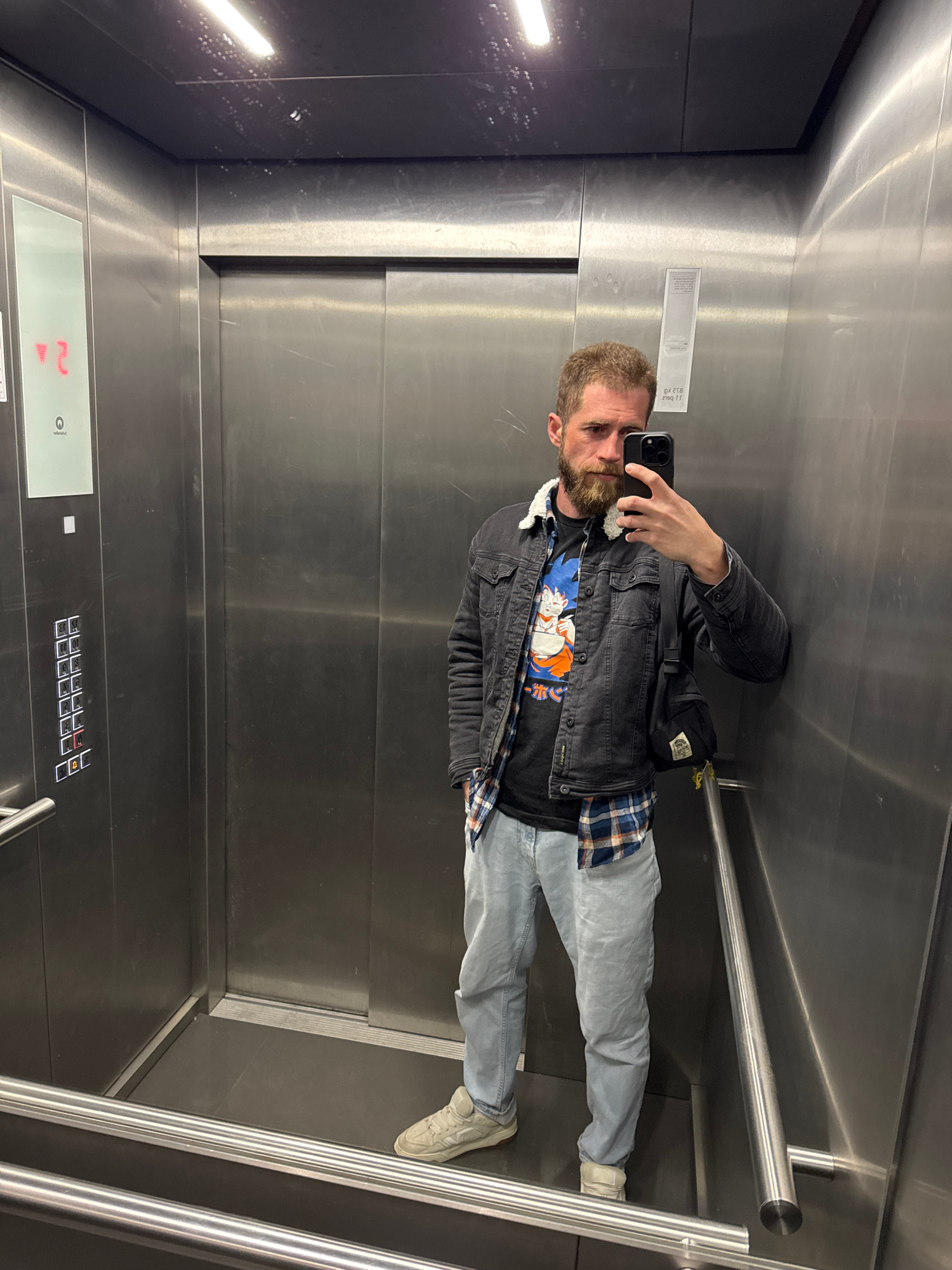 A man is taking a selfie in an elevator with stainless steel interior walls. He is wearing a denim jacket, a t-shirt with a graphic print, light blue jeans, and white sneakers. He has a beard and appe…read more
