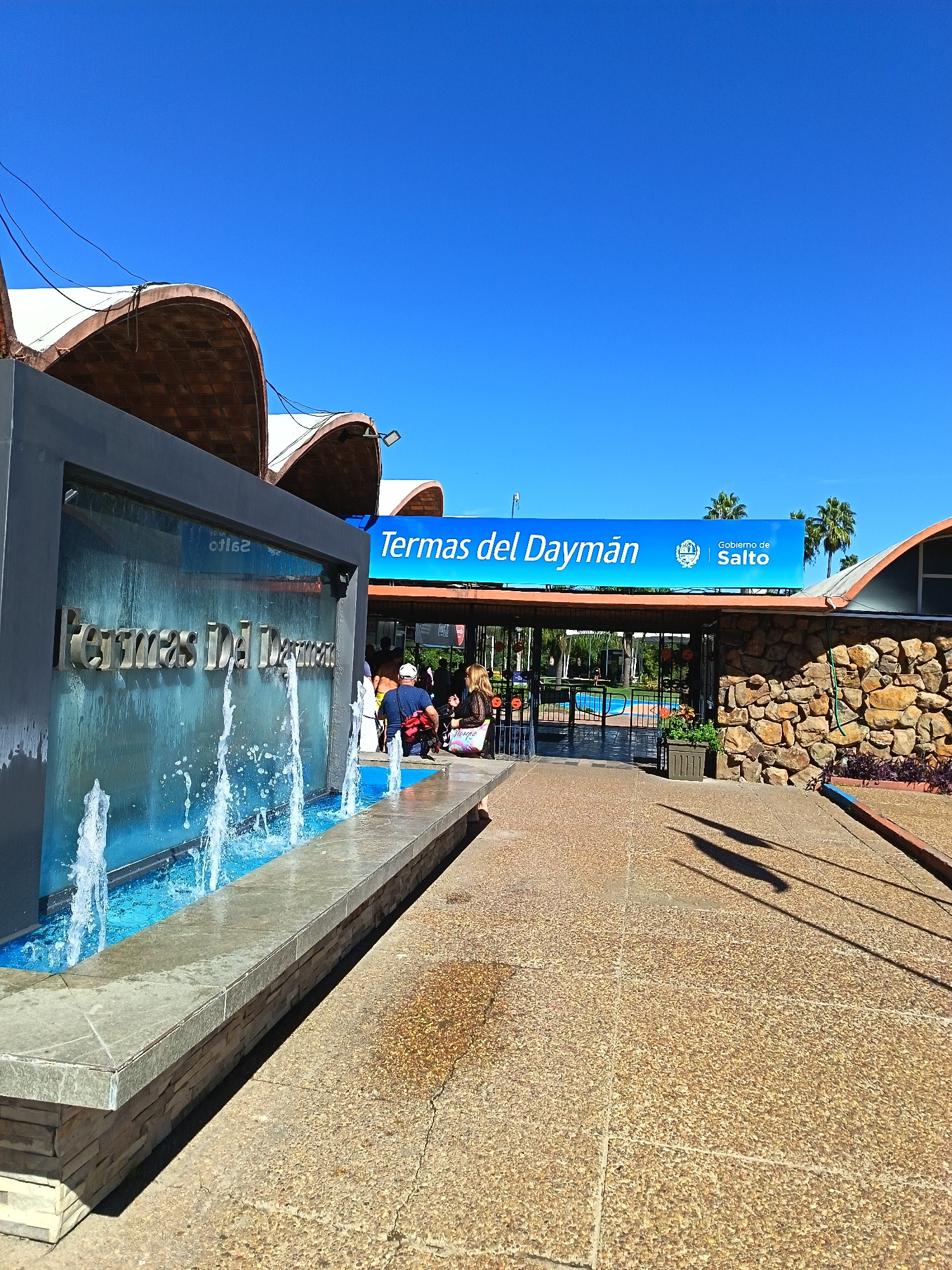 The photograph depicts the entrance to Termas del Daymán, a hot springs resort located in the city of Termas del Daymán, Uruguay. A blue sign reading "Termas del Daymán, Gobierno de Salto" is prominen…read more