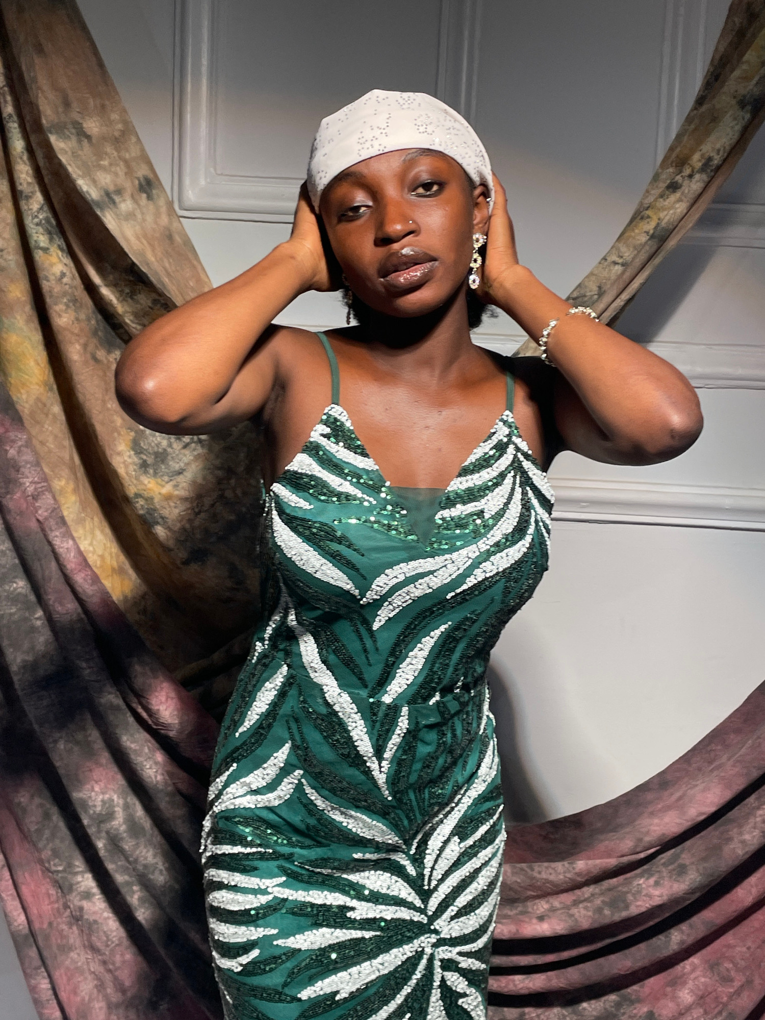 A dark-skinned woman is reclined and posing indoors. She is wearing a white headscarf, dangling earrings, and a bracelet on her left wrist. Her green dress has white striped detailing. Her hands are p…read more