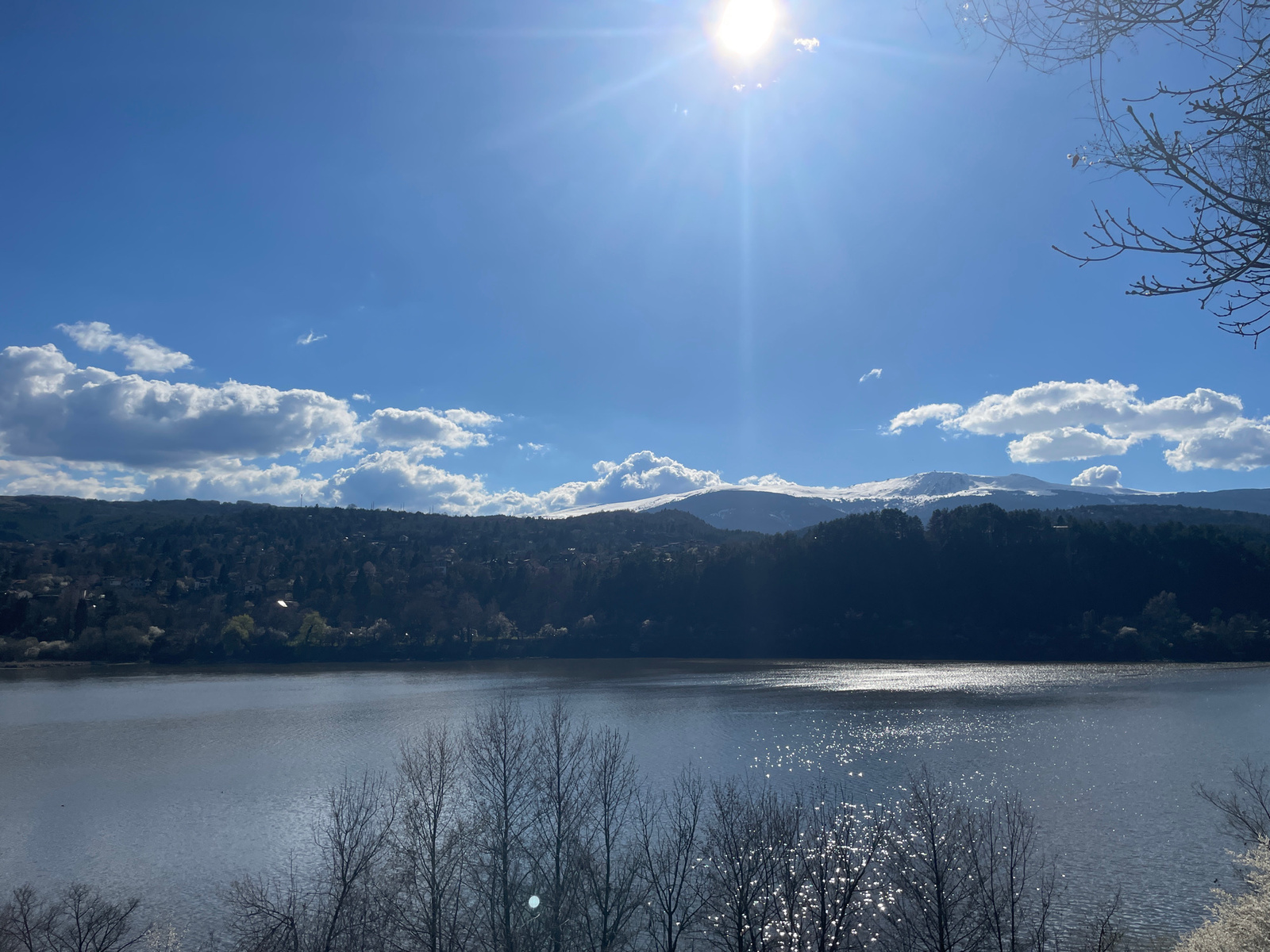 The image shows a wide shot of a lake landscape with snow-capped mountains in the background. The sky is bright blue with scattered cumulus clouds and a bright sun causing glare. In the foreground, th…read more