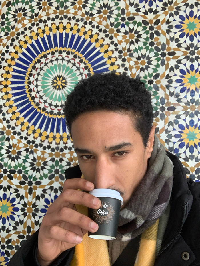 A person with curly dark hair holds a small black coffee cup with a white lid against a vibrant tile background. The cup has a coffee logo. The individual has light skin and is wearing a gray scarf anβ¦read more