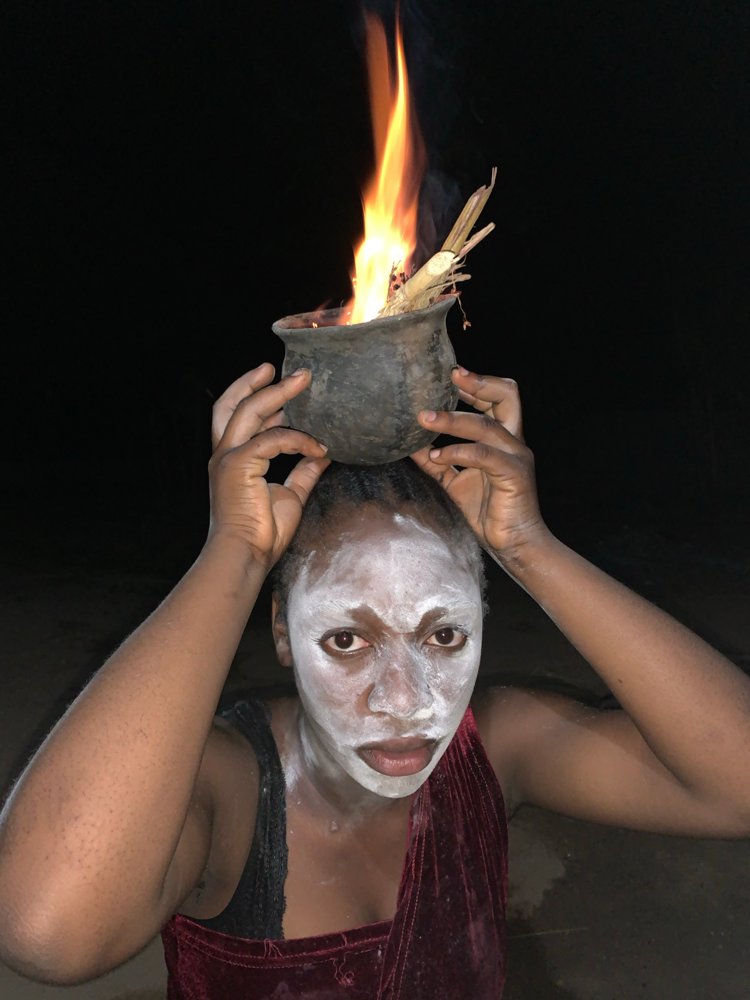 A person with dark skin, covered in white powder on their face, is holding a dark, primitive pot that contains a fire with flames emanating from it. The person is wearing a dark-colored top and a maroβ¦read more