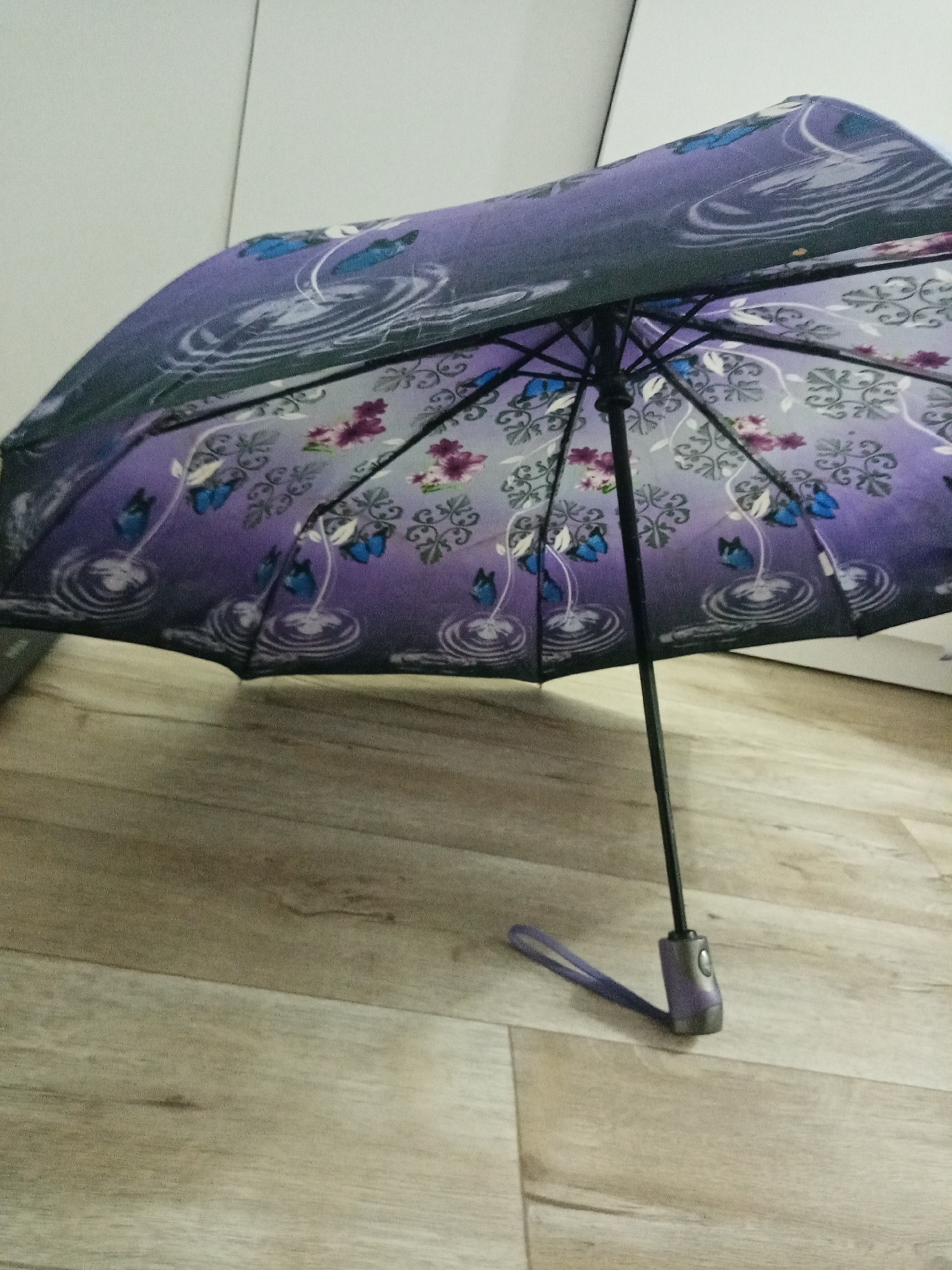 A slightly opened umbrella stands on a light-colored, wood-grain floor. The umbrella's fabric is a gradient of purple, adorned with butterfly and flower designs, and water ripple patterns. The umbrell…read more