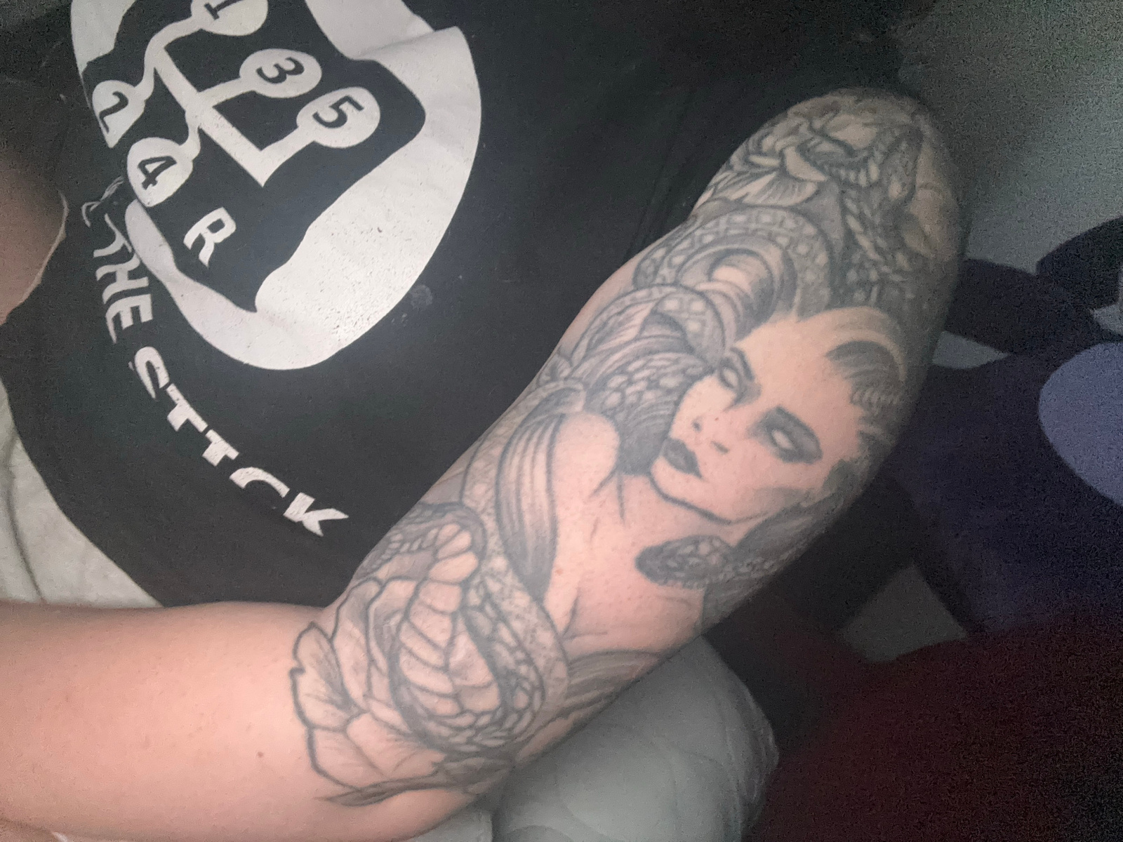A close-up shot of a person's upper arm with a large tattoo of a woman's face and a snake entwined around her hair. The arm is resting on the person's chest, with the person wearing a black t-shirt wi…read more