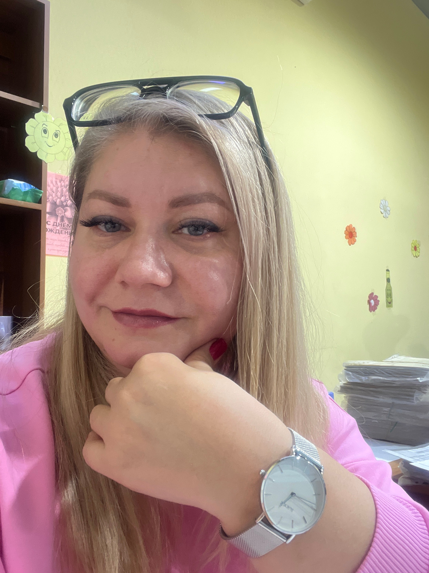 A fair-skinned woman with blonde hair is posing for a selfie. She is wearing glasses and a silver watch with a white face. She is wearing a pink sweater. Behind her is a yellow wall with several flora…read more