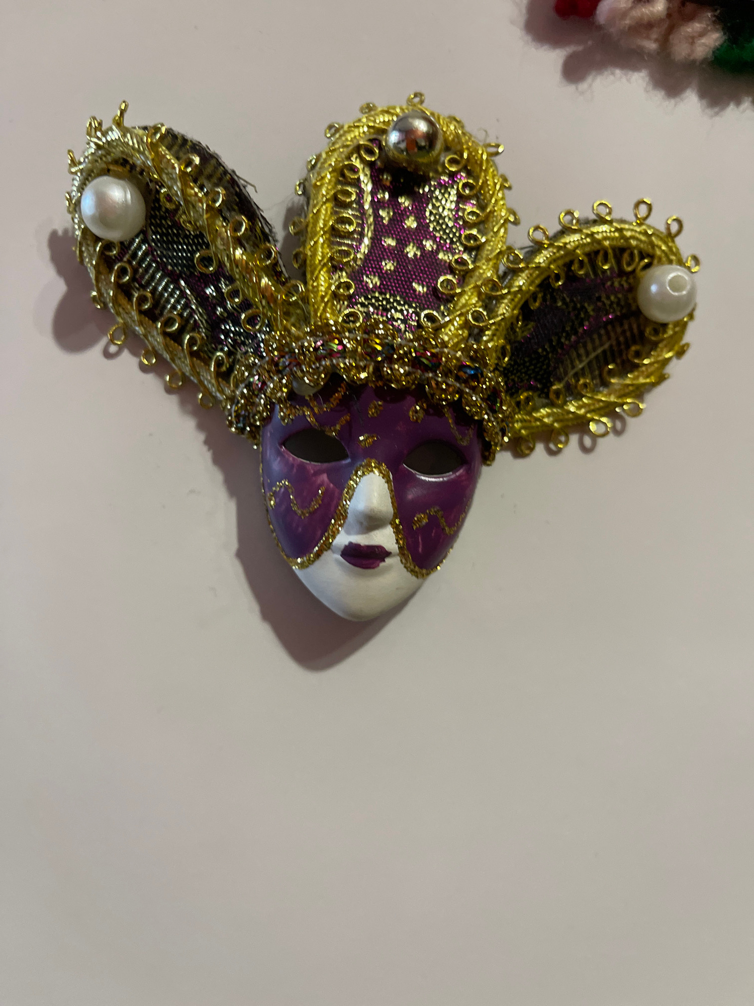 The image shows a decorative Venetian mask on a light pink surface. The mask is primarily purple and white, with intricate gold detailing and embellishments. It has a classic Venetian design with an e…read more