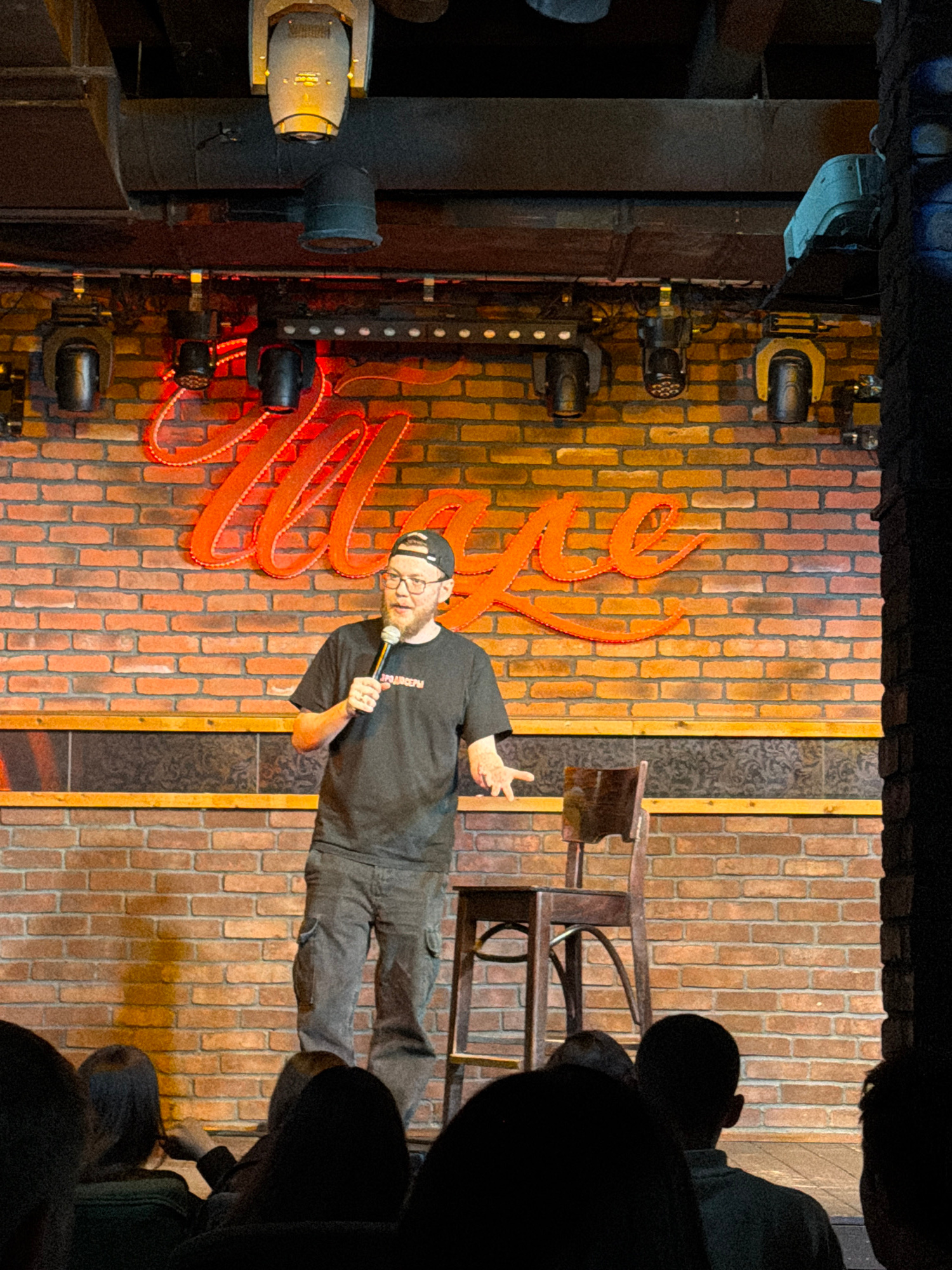 A man on stage is performing stand-up comedy in Klin, Russia. The man is wearing a black t-shirt and dark pants, holding a microphone. The stage has a brick wall backdrop with orange neon signs. There…read more