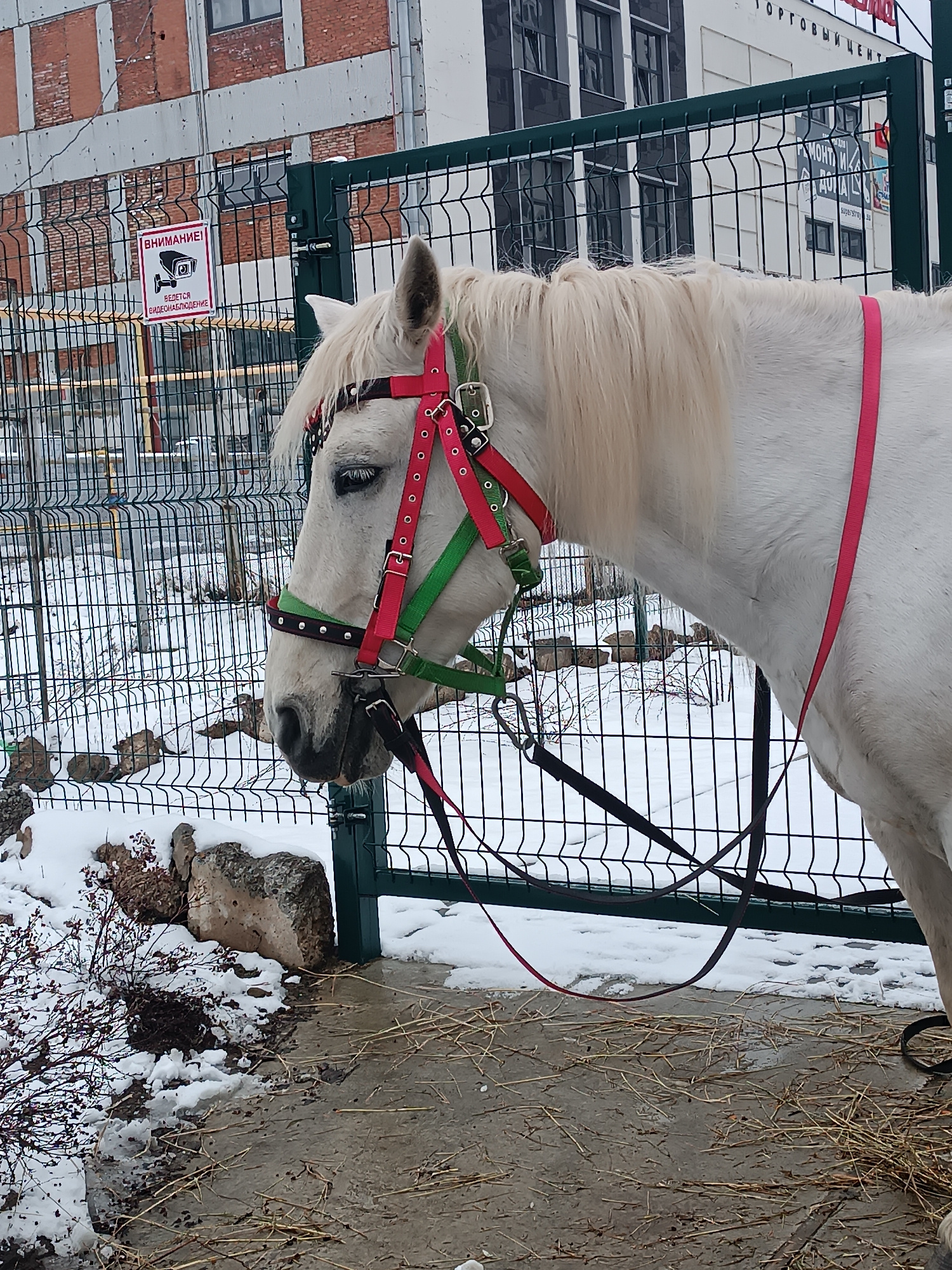 A white horse stands near a metal fence, adorned with a red and green bridle. A sign on the fence displays Russian text and an image of a surveillance camera. Patches of snow are visible on the ground…read more
