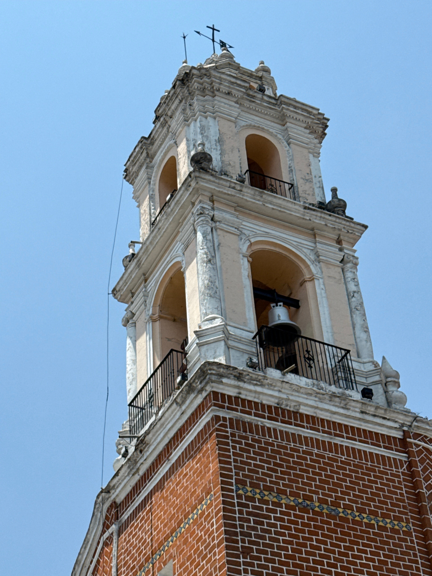 An ornate bell tower or church facade is captured from a low-angle perspective, viewed against a clear, bright blue sky. The image is oriented sideways, but depicts a vertical structure. The tower is…read more