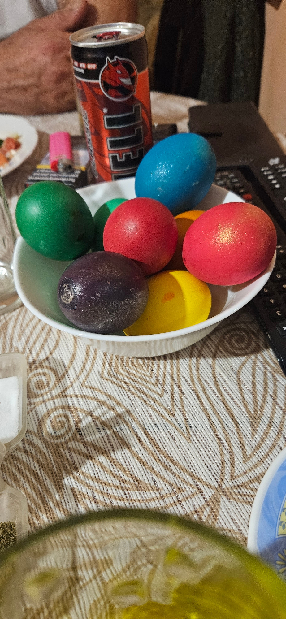 The image shows a tilted view of a table setting, likely indoors. A white bowl contains several dyed Easter eggs in various colors: red, blue, yellow, dark purple, and green. A red and black can of He…read more