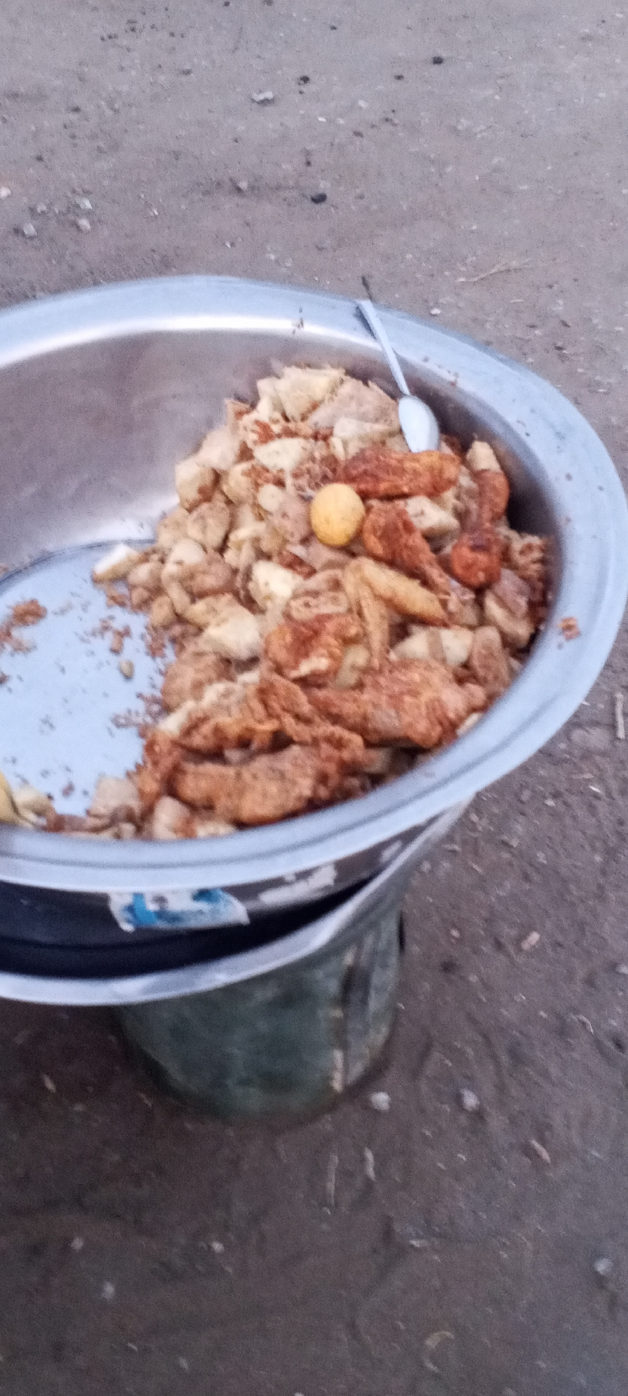 A metal bowl filled with food sits atop a container. The food appears to be a mix of fried items, including what could be chicken or similar breaded pieces, and what may be potatoes. There is also a s…read more