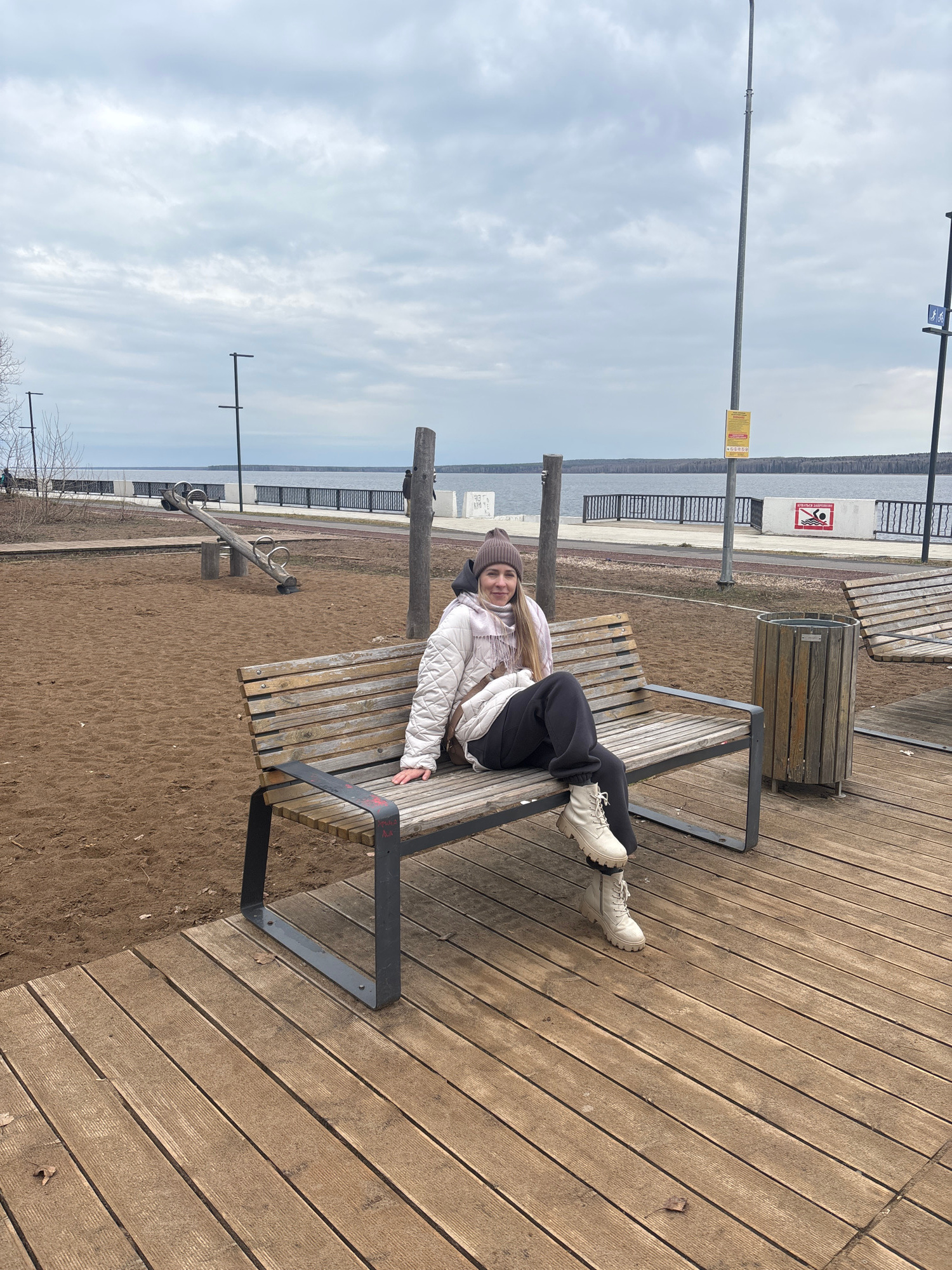 A woman is lying on a bench at a waterfront park. The woman is wearing a light-colored quilted jacket, dark pants, a beanie, and white boots. She is facing the camera with a slight smile. The bench is…read more