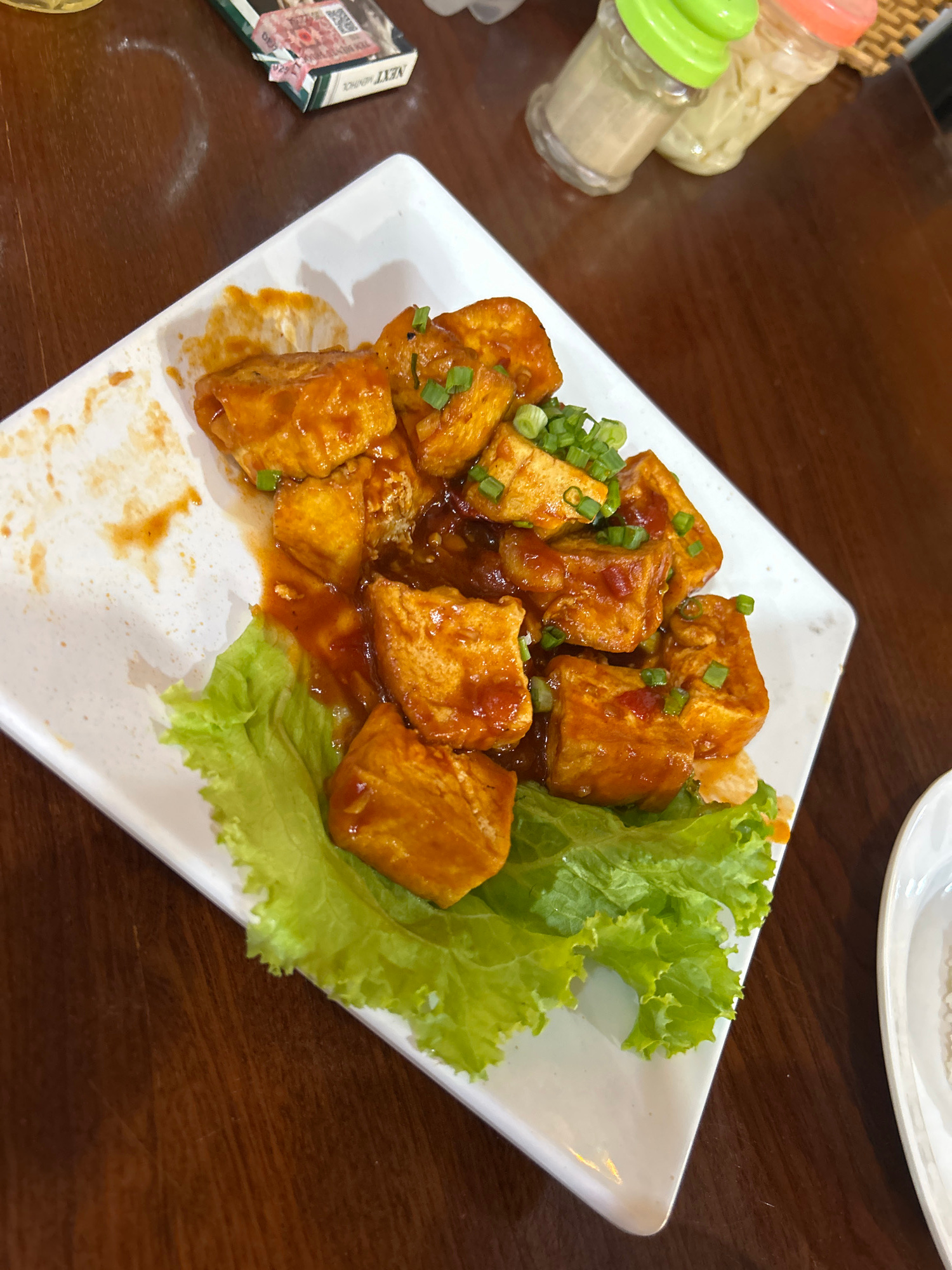 A square, white ceramic plate on a dark wooden table holds fried tofu cubes coated in a reddish-brown sauce, garnished with chopped green onions and accompanied by green lettuce leaves. To the left of…read more