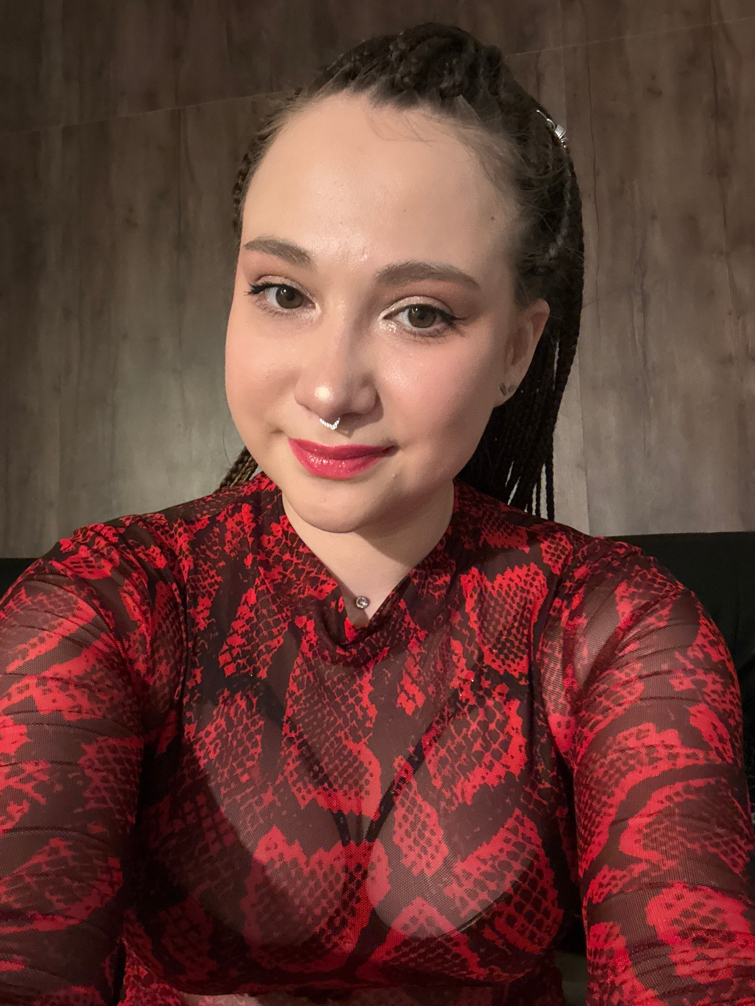 A fair-skinned young woman with braided hair and a nose ring poses in a red and black snake-print top. The background appears to be a simple interior setting with a dark wall or surface. The location…read more