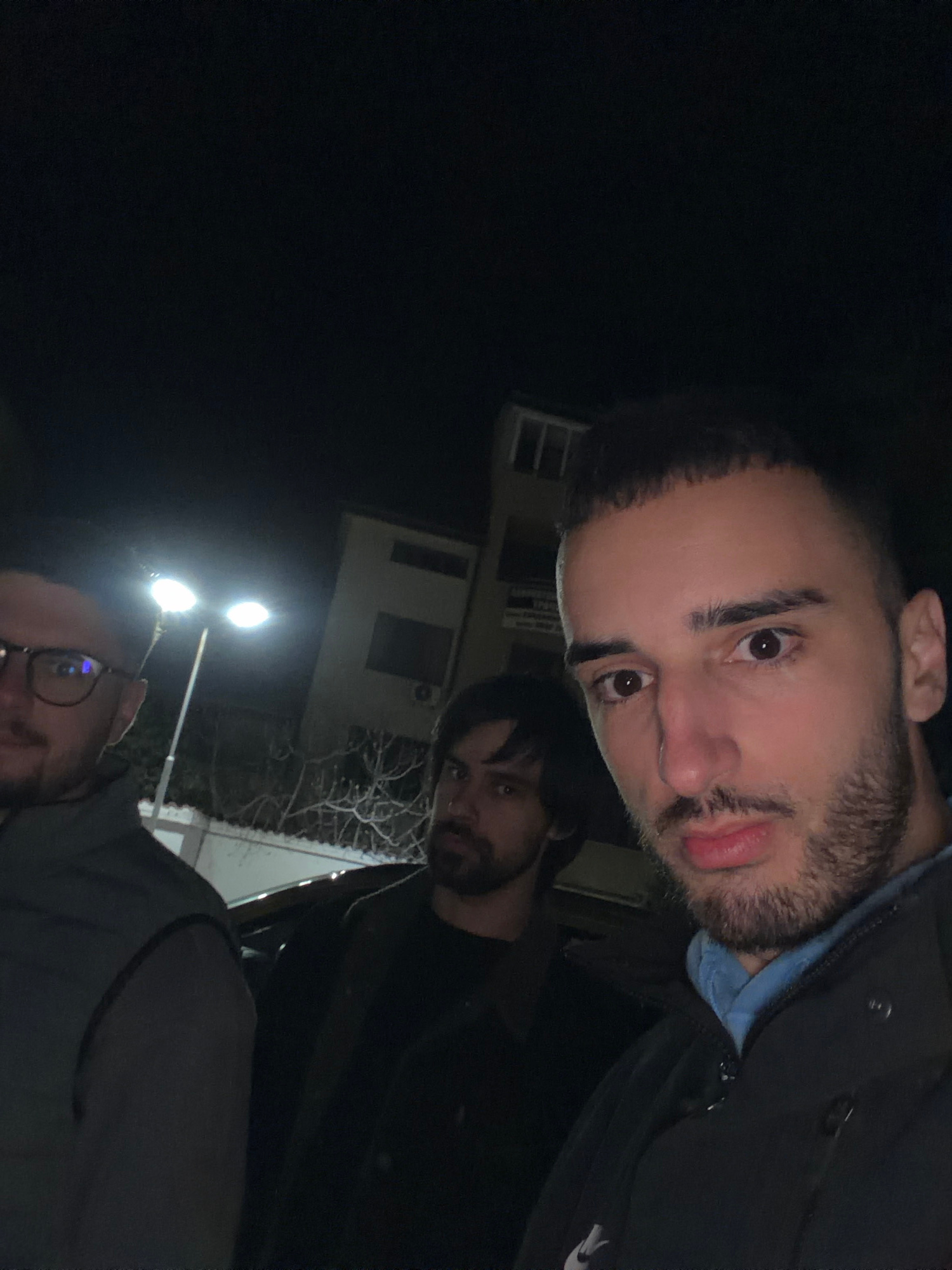 Three individuals are present in this nighttime photograph. The person closest to the camera is a man wearing glasses. A second man is visible partially behind him, and a third man is positioned in th…read more