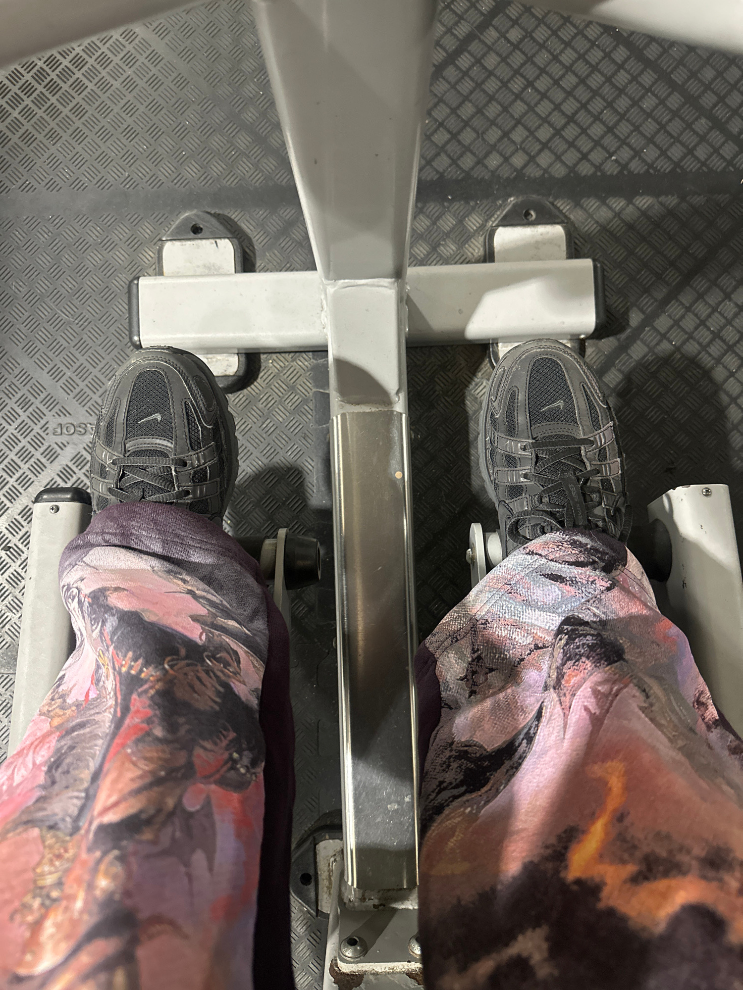The image shows a view from above of a person seated on a leg press machine in a gym or fitness center. The machine has metal footrests where the person's feet are placed. The person is wearing dark g…read more