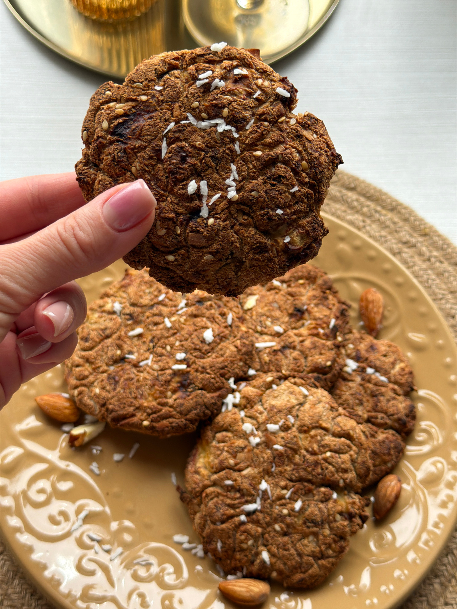 A hand is holding a brown, textured cookie with scattered white flakes. The cookie's surface has a slightly rough texture. In the background, there are three more similar cookies on a light brown plat…read more