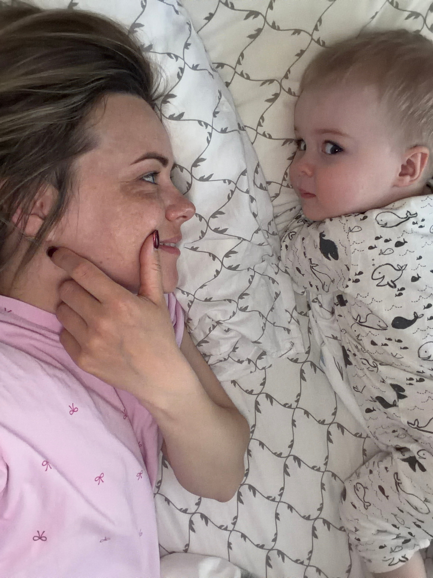 A woman and a baby are lying on a bed. The woman is lying on her back, wearing a pink top and has brown hair. She is holding her hand to her face. The baby is lying on the bed next to the woman and is…read more