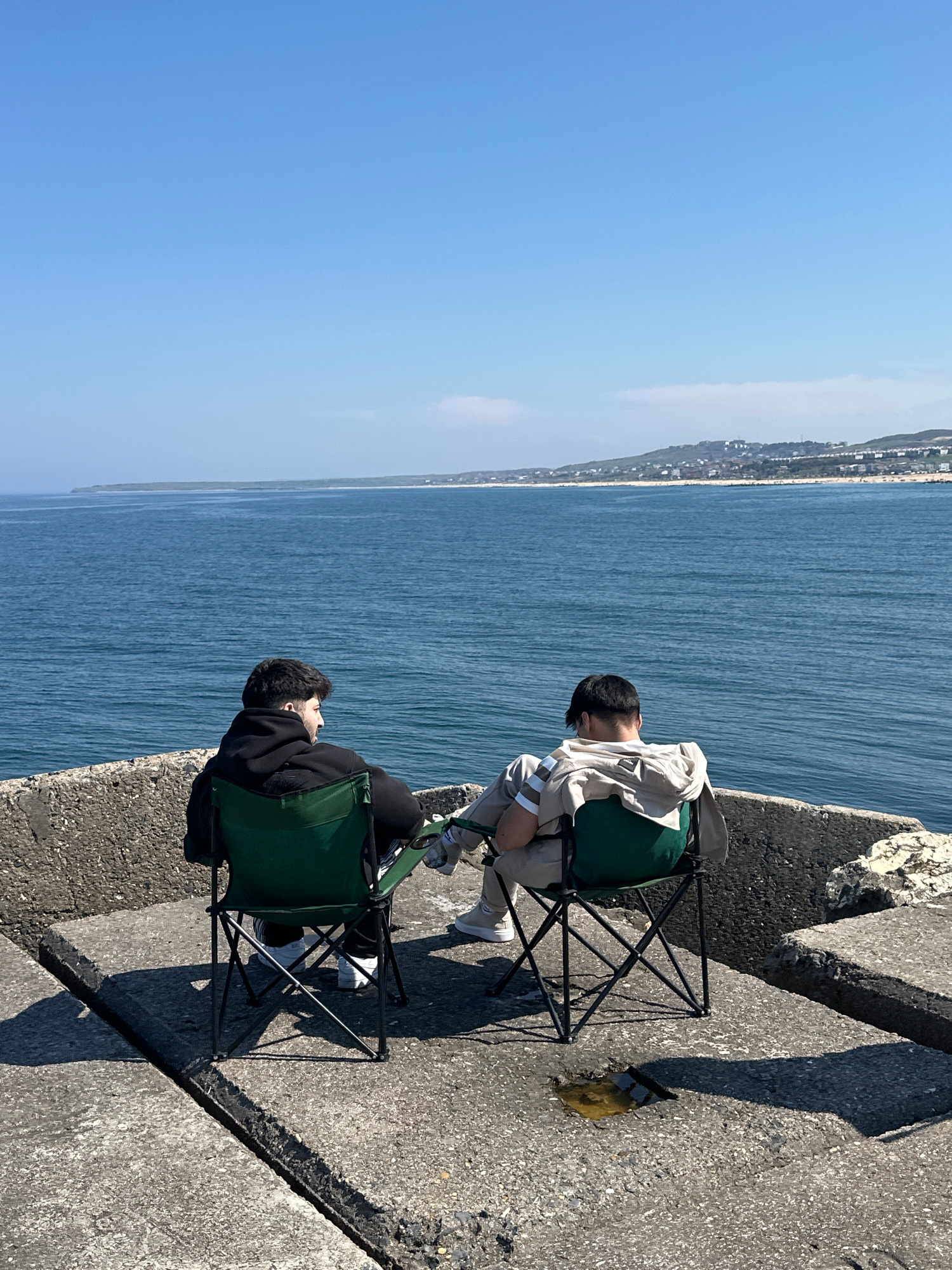Two young men are sitting on green folding chairs at the edge of a concrete pier. They are positioned with the water to their left and a stretch of coastline visible in the distance. The man on the ri…read more