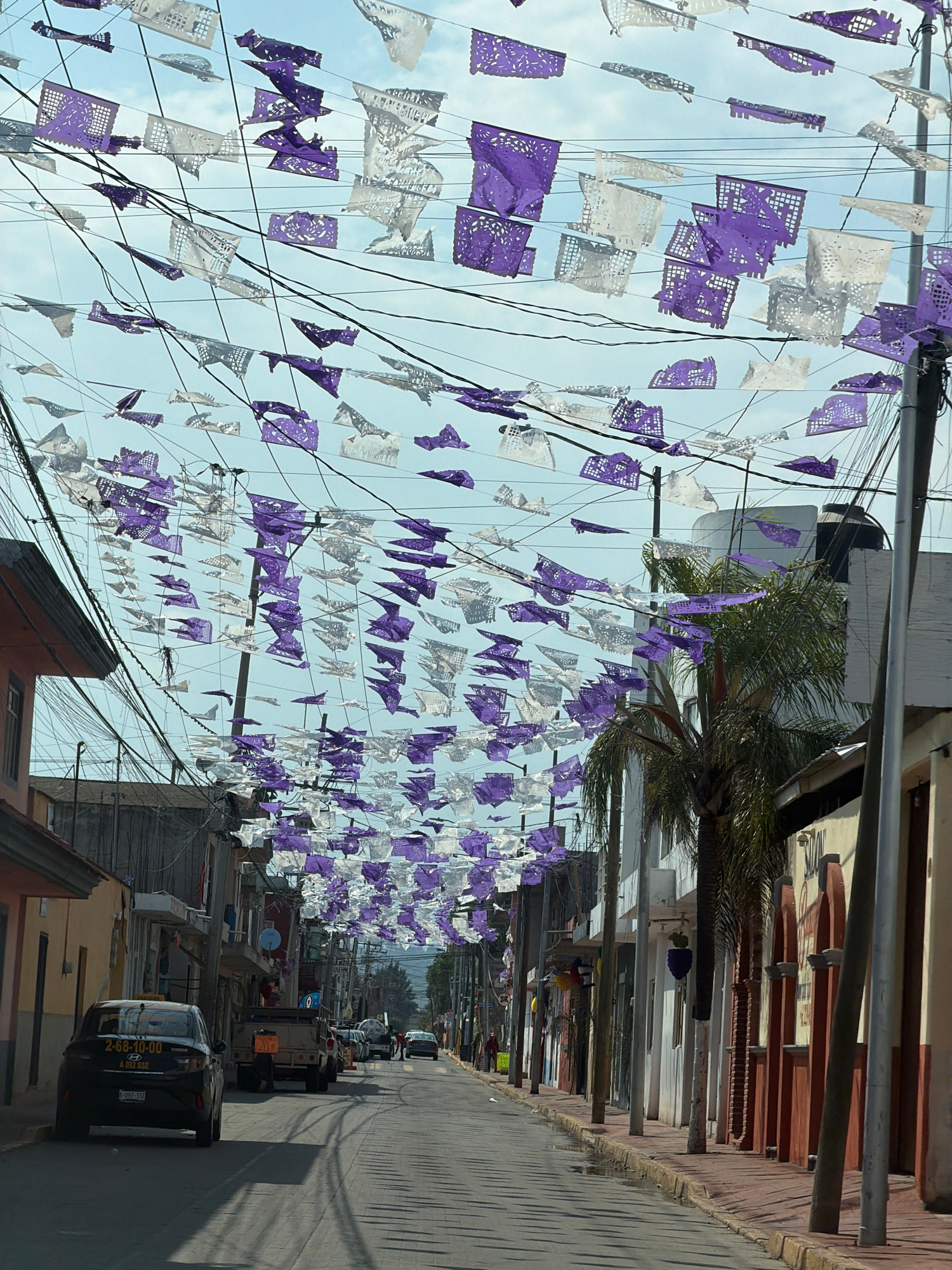 The image shows a street in San Andrés Cholula, Mexico, decorated with hanging Papel Picado banners in white and purple. Banners are strung across the street above traffic. The banners are suspended a…read more