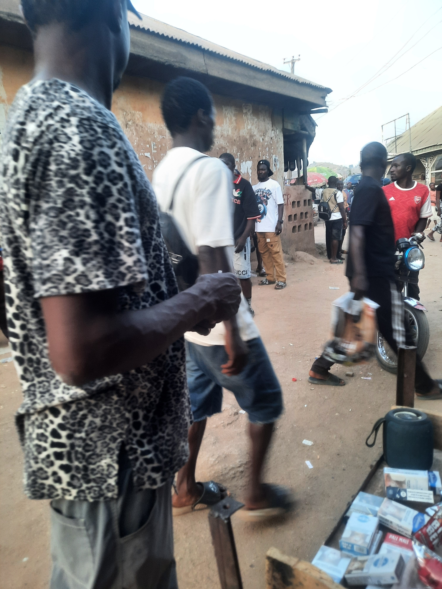 The image depicts an outdoor scene in Gwong, Nigeria. Several people are present, some standing and some walking. One man is wearing a shirt with a leopard print pattern. Another man is on a motorcycl…read more