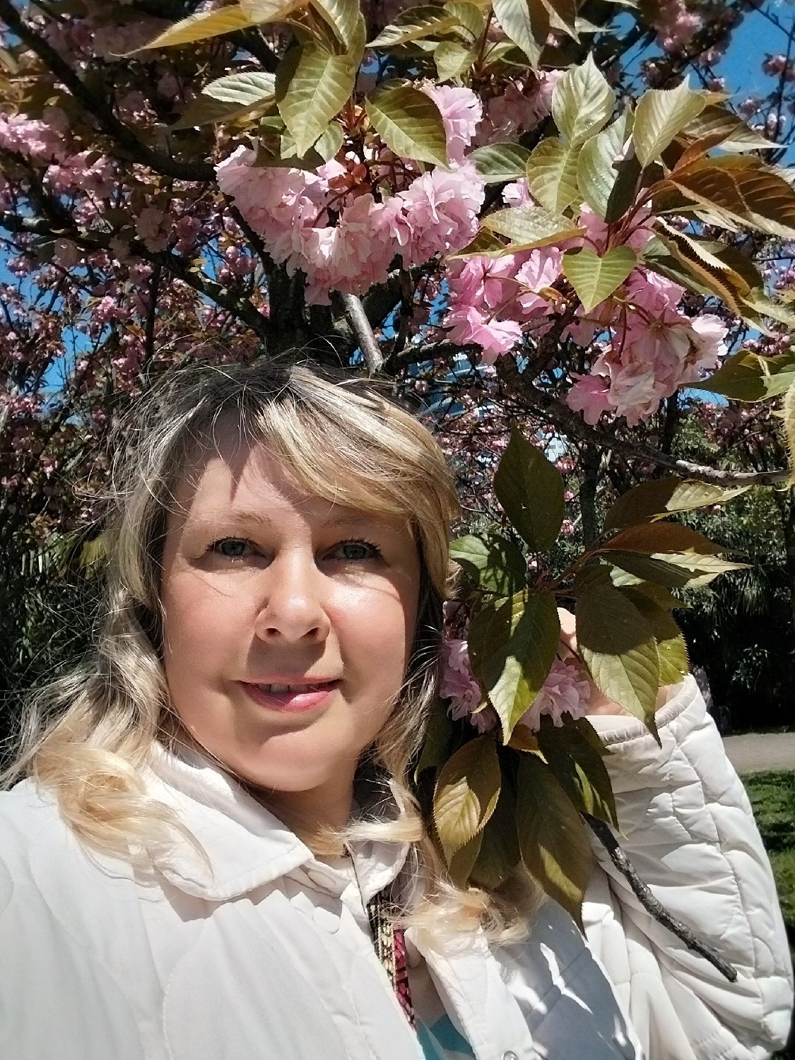 A vibrant outdoor portrait captures a smiling woman amidst blooming cherry trees under a clear blue sky. The main subject is a woman with blonde hair, light-colored eyes, and a pleasant smile, looking…read more