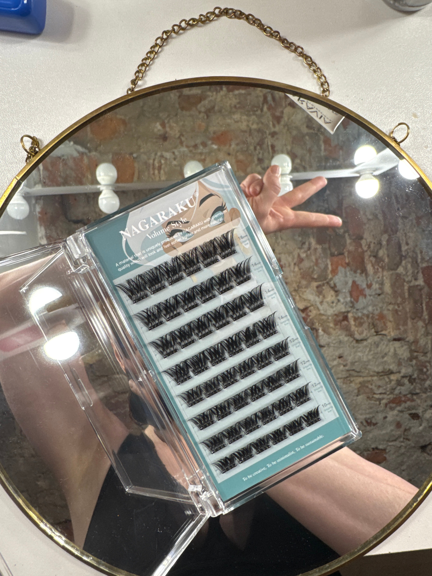 The image is an overhead shot of a vanity mirror with a gold frame and chain. The mirror reflects a hand giving a peace sign. An open package of NAGARAKU Volume Style individual false eyelashes is on…read more