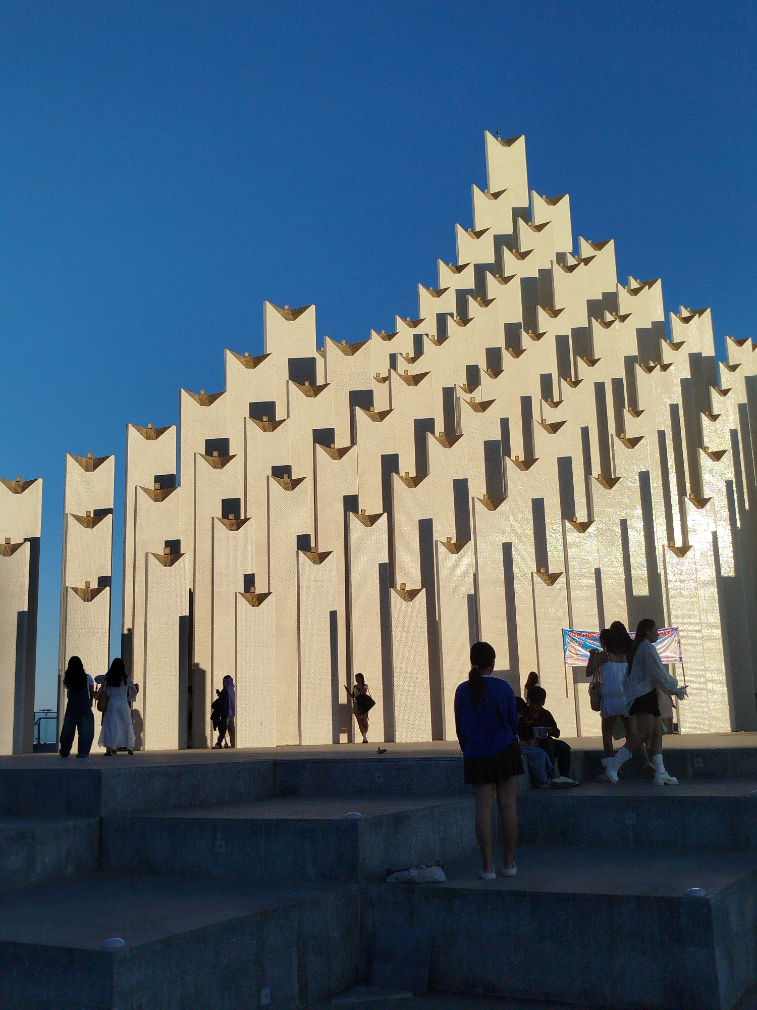 The image depicts a large, white, tessellated architectural structure with gold-colored accents under a clear blue sky. The structure appears to be a monument or pavilion with a stepped, pyramidal des…read more