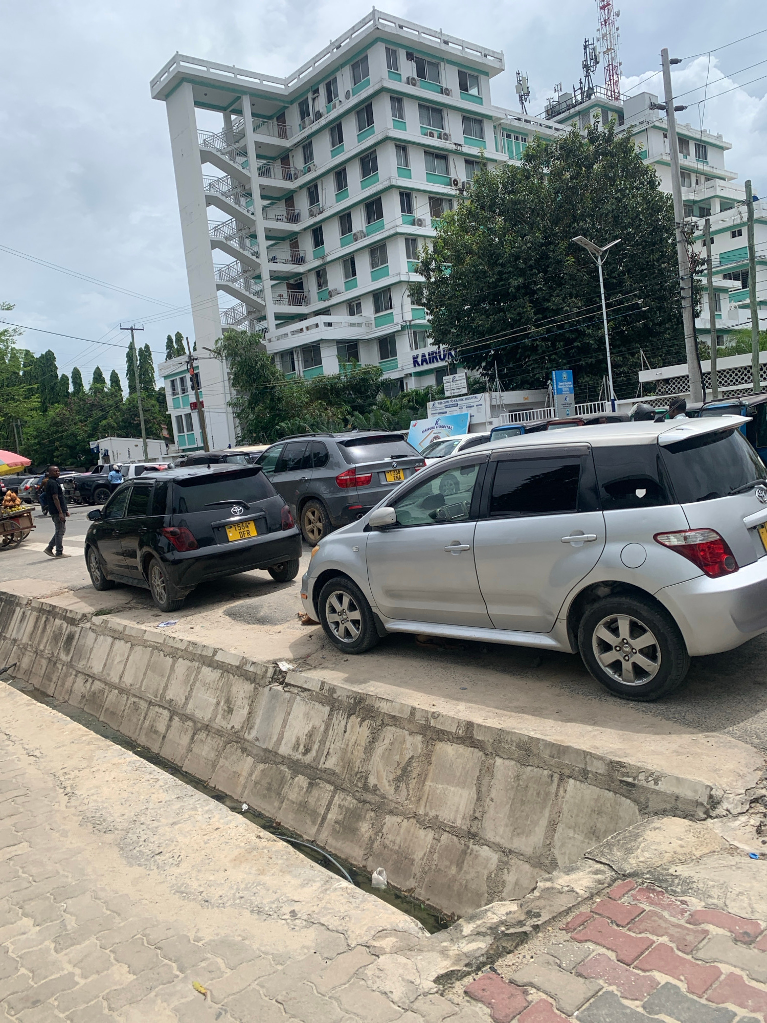 The image depicts a street scene in Dar es-Salaam, Tanzania. Parked along the right side of the street are several cars, including a silver Toyota, a gray SUV, and a black Toyota with a yellow license…read more