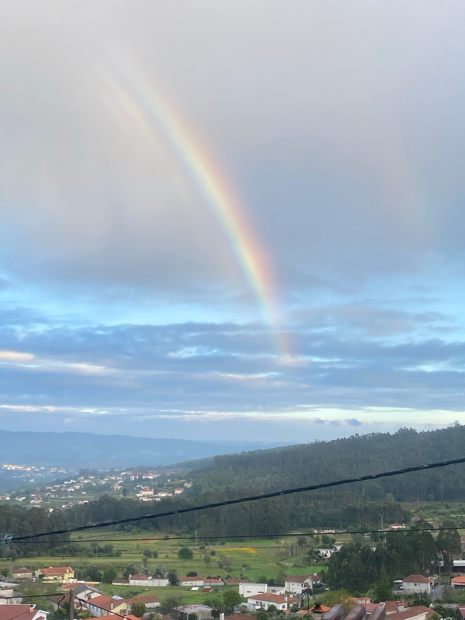 A slightly tilted outdoor shot captures a partial rainbow arcing across a cloudy sky. The rainbow's vibrant colors are visible against the white and blue hues of the clouds. To the right, a sloping laβ¦read more