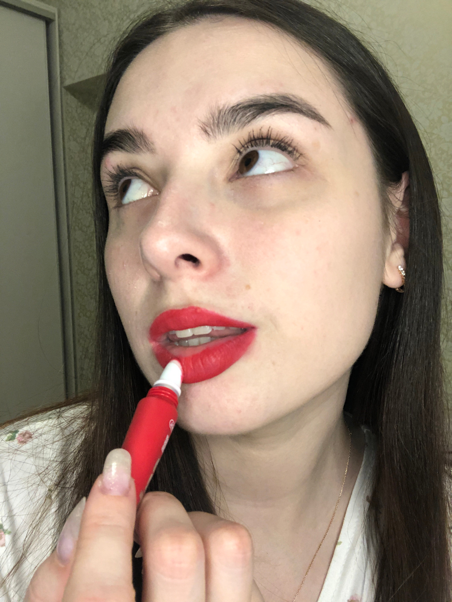 A woman with dark hair is applying red lipstick. She is wearing a light-colored floral top and a gold necklace. She has light skin, dark eyebrows, and brown eyes. She is holding a small red tube of li…read more